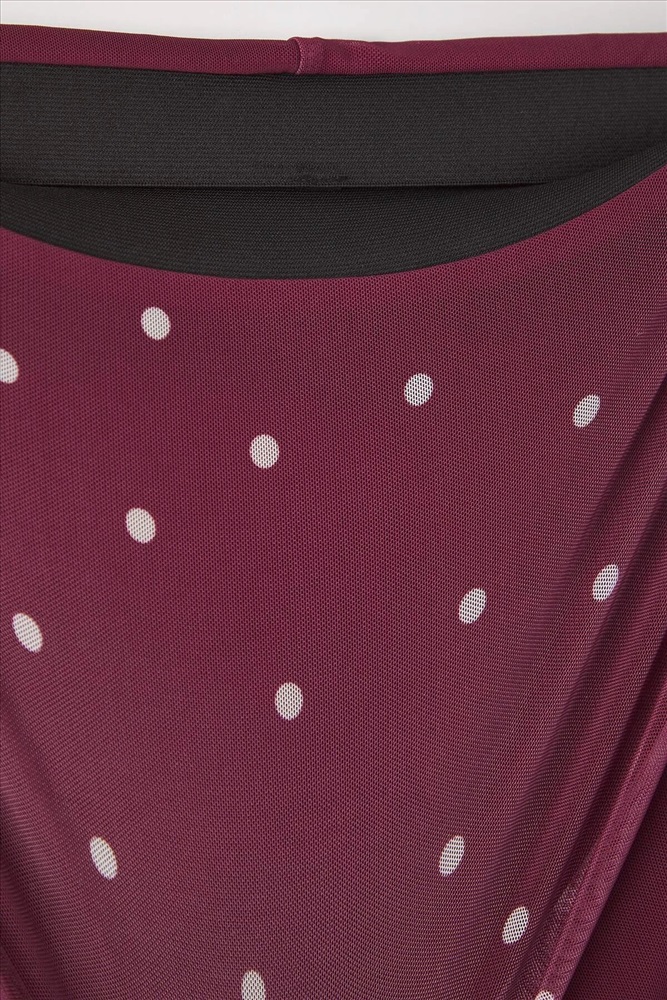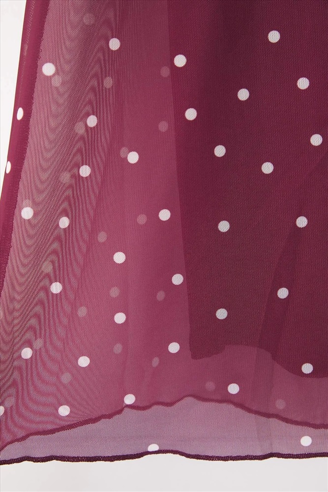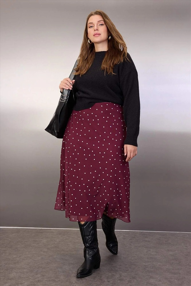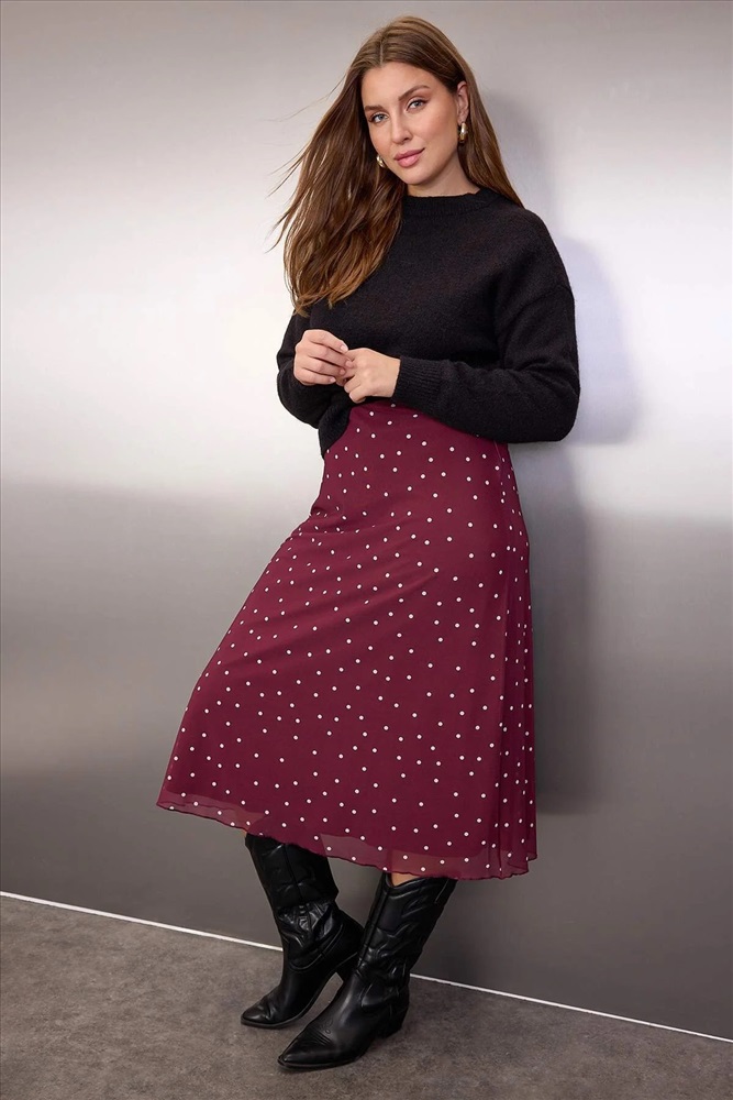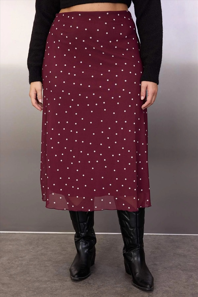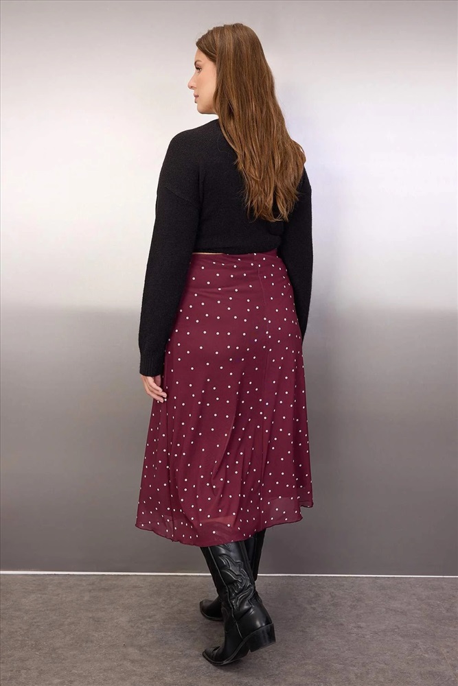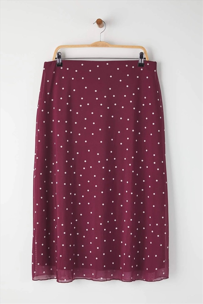 Bordo A- Line Puantiye Desenli Tül Örme Büyük Beden Etek TBBAW25AZ00006