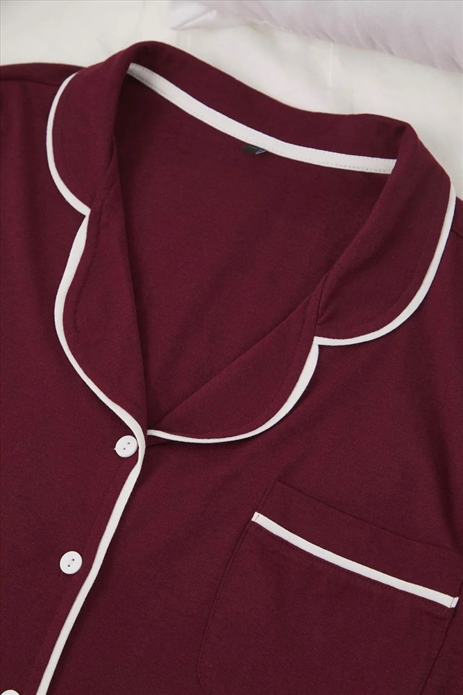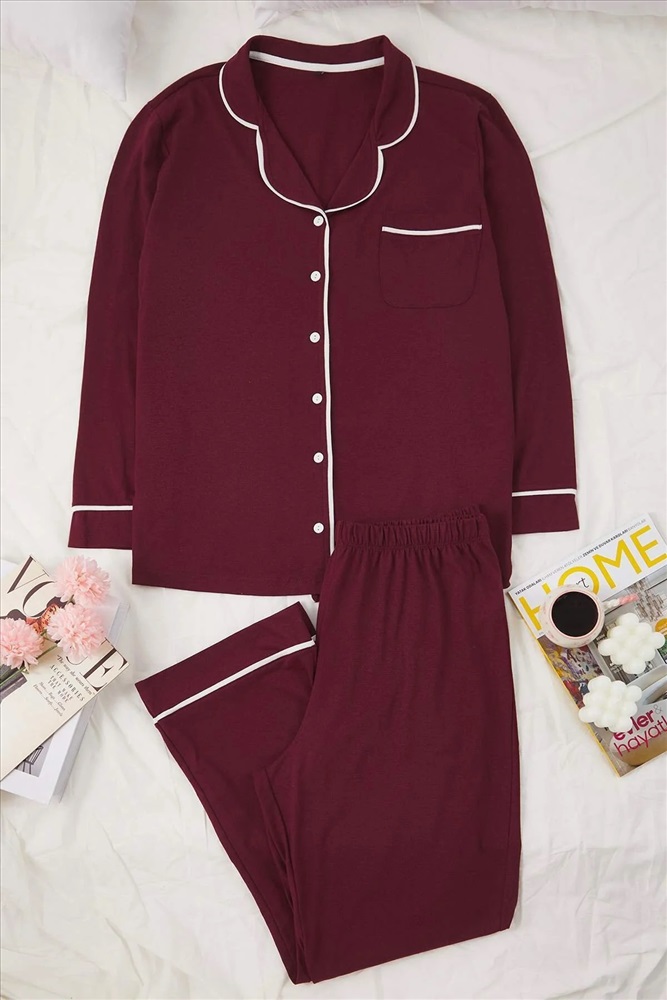 Bordo Biye Detaylı Gömlek Yaka Örme Pijama Takımı TBBAW26AI00032