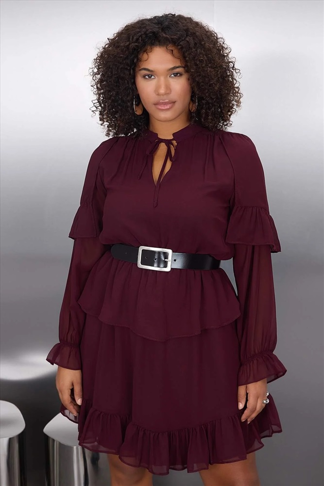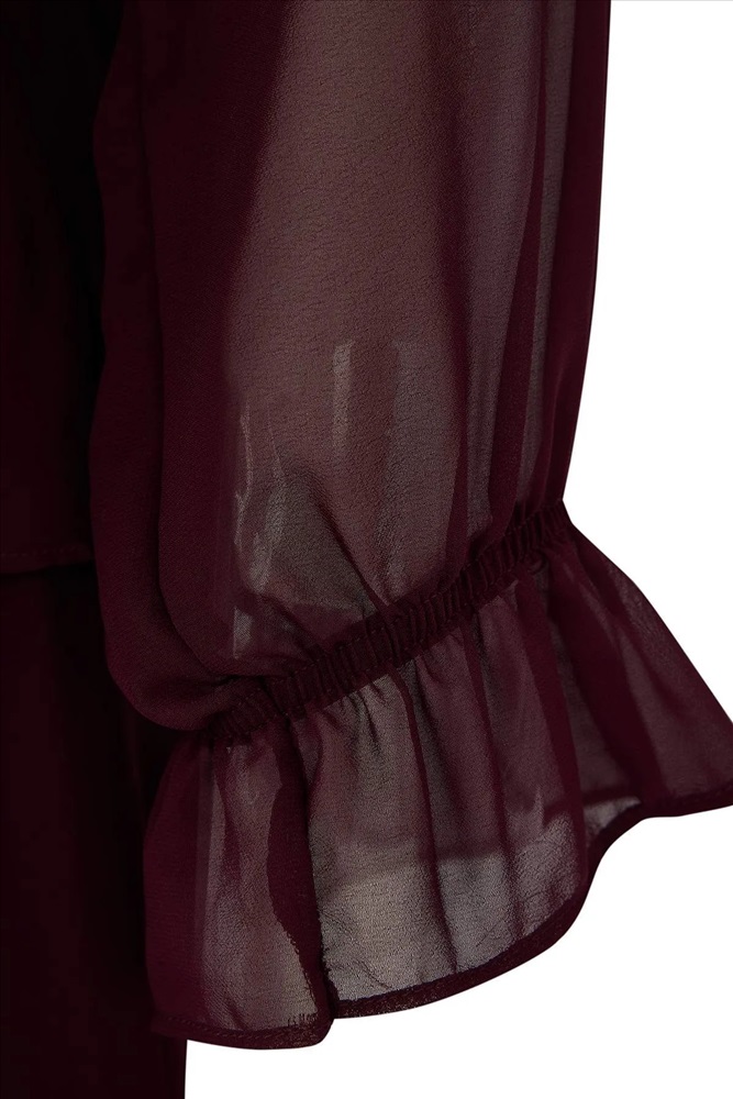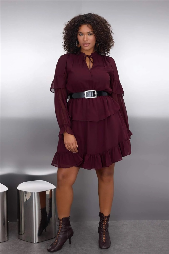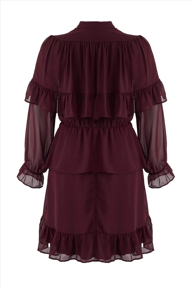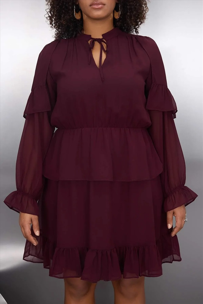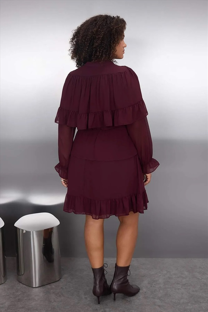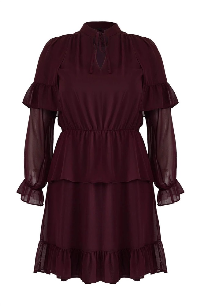Bordo Şifon Lastik Belli Volanlı Mini Dokuma Büyük Beden Elbise TBBAW26AH00003