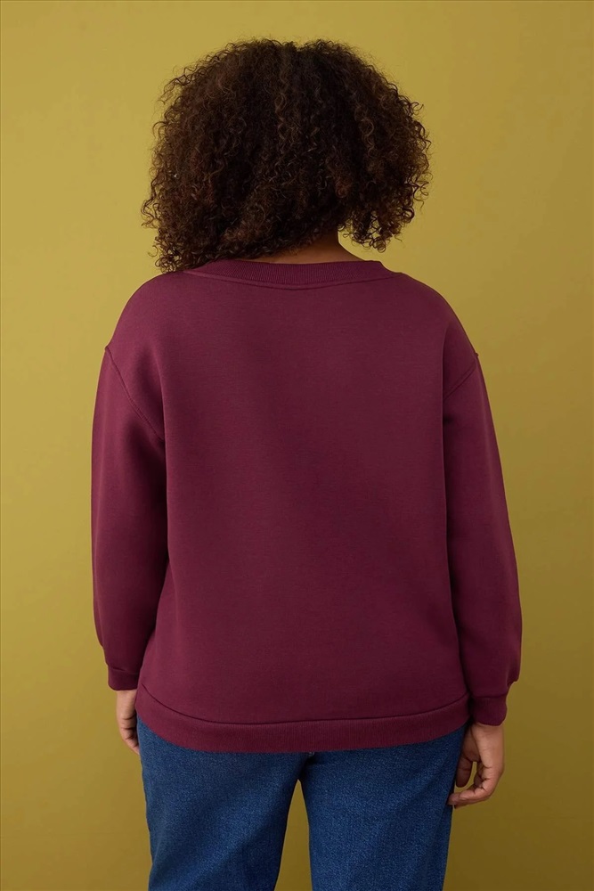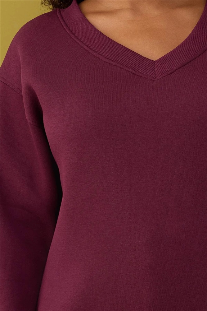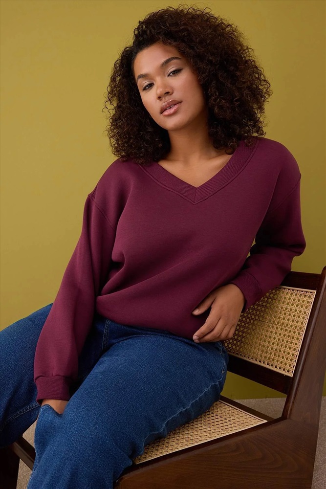Bordo V Yaka İçi Polarlı Büyük Beden Sweatshirt TBBAW26AO00012