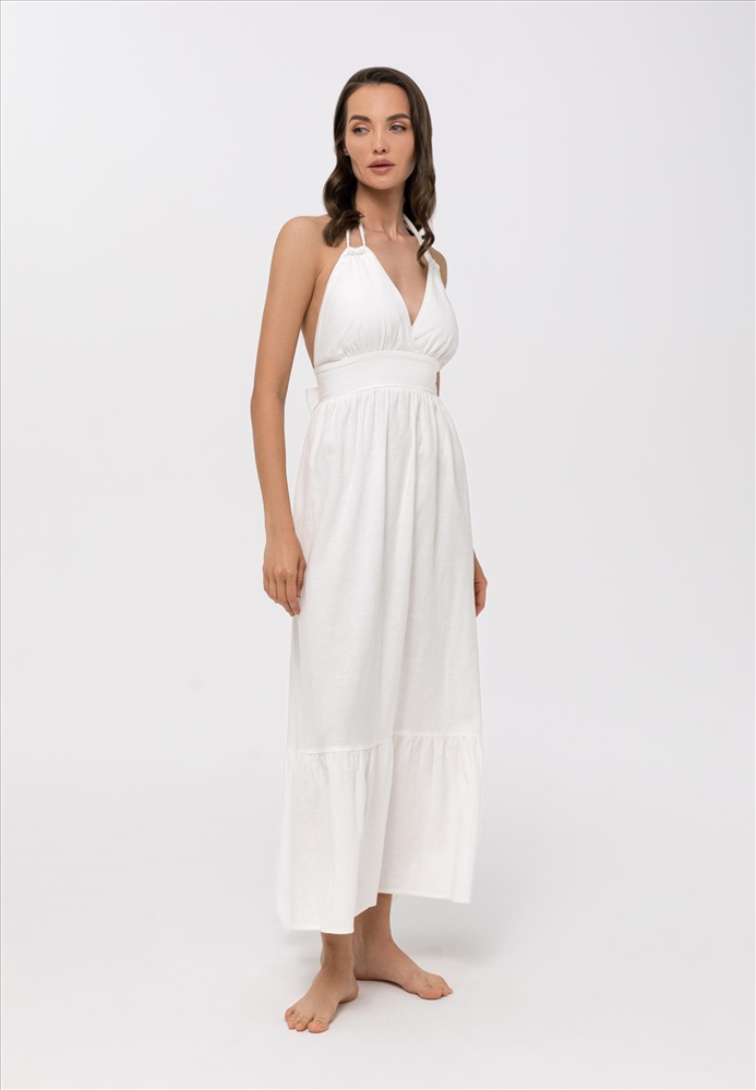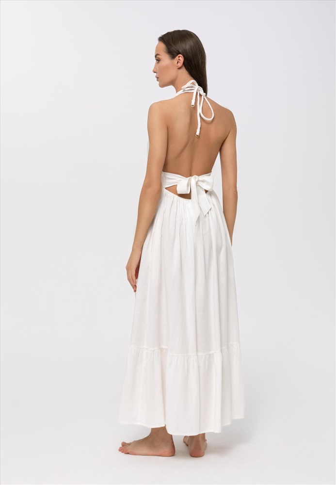 Длинный сарафан полуприлегающего силуэта из льна и вискозы. Боковые карманы. Плетенные бретели-спагетти вокруг шеи. Объем под грудью регулируется широким поясом с завязкой на спине.