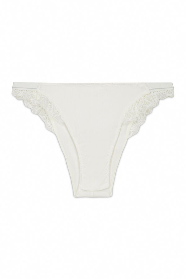 Braga brasileña de rib de algodón y puntilla, con goma personalizada a tono. Diseñada para ofrecer un ajuste perfecto y un look elegante.