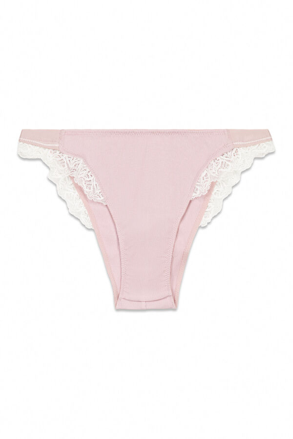 Braga brasileña de rib de algodón y puntilla, con goma personalizada a tono. Diseñada para ofrecer un ajuste perfecto y un look elegante.