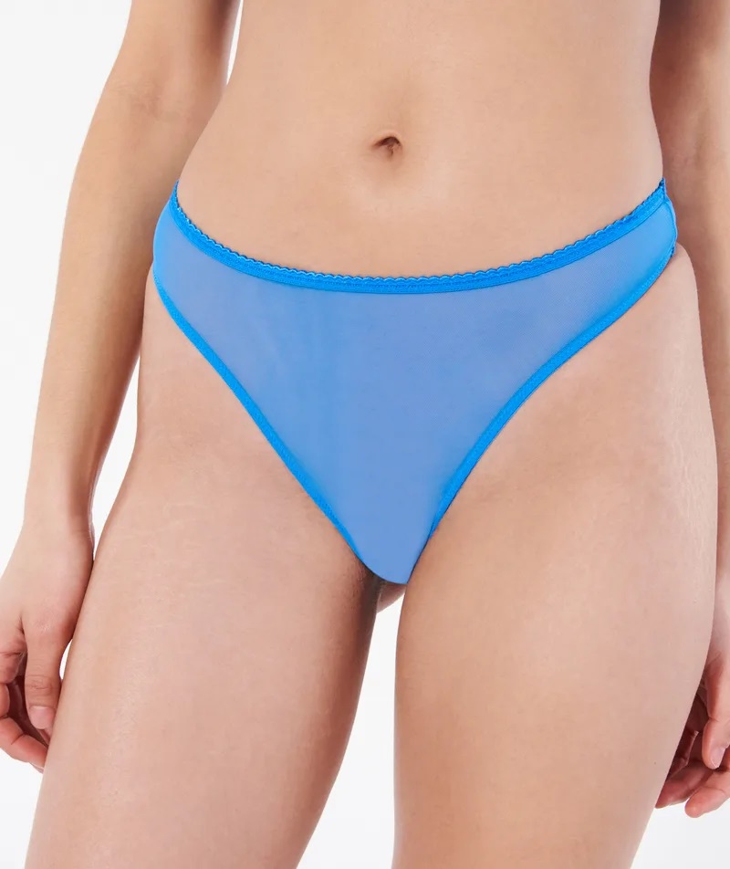 Descubre la braguita tanga SIMPLYIZ confeccionada en tul azul transparente. Aporta una sutil estilo a tu lencería gracias a sus delicados ribetes. Es EL tanga de moda para un look sexi y sencillo.