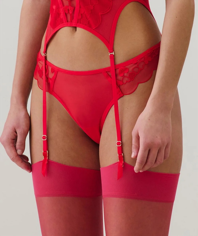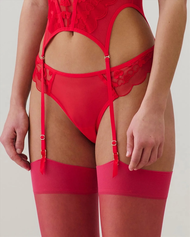 Enamorate de las braguitas HEARTLOVIZ. Confeccionadas en malla roja, seducen con su delicado bordado de corazon realzado con toques de lurex y su bonito lazo adornado con una joya en forma de corazon en la parte trasera. ¡Para un look de San Valentin irresistible, combinalas con el sujetador de la misma coleccion!