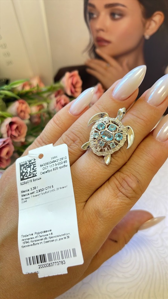 Брошь из серебра с фианитами родированная - Черепаха БДБр018