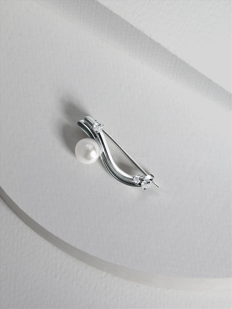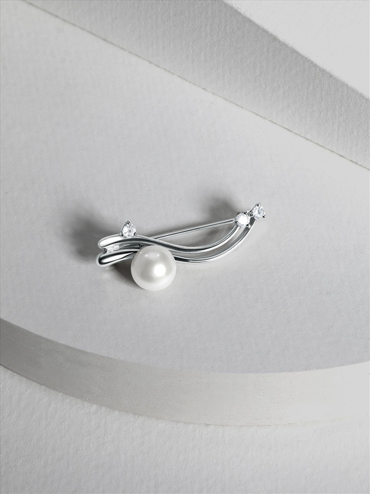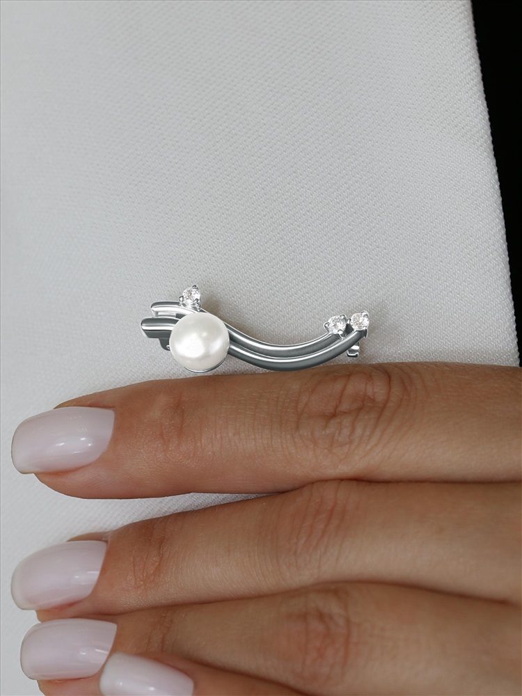 Брошь из серебра с культивированным жемчугом и фианитами родированная Бр-17р1005