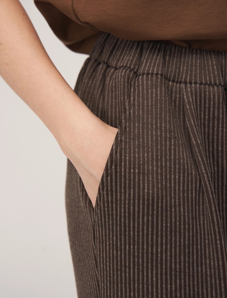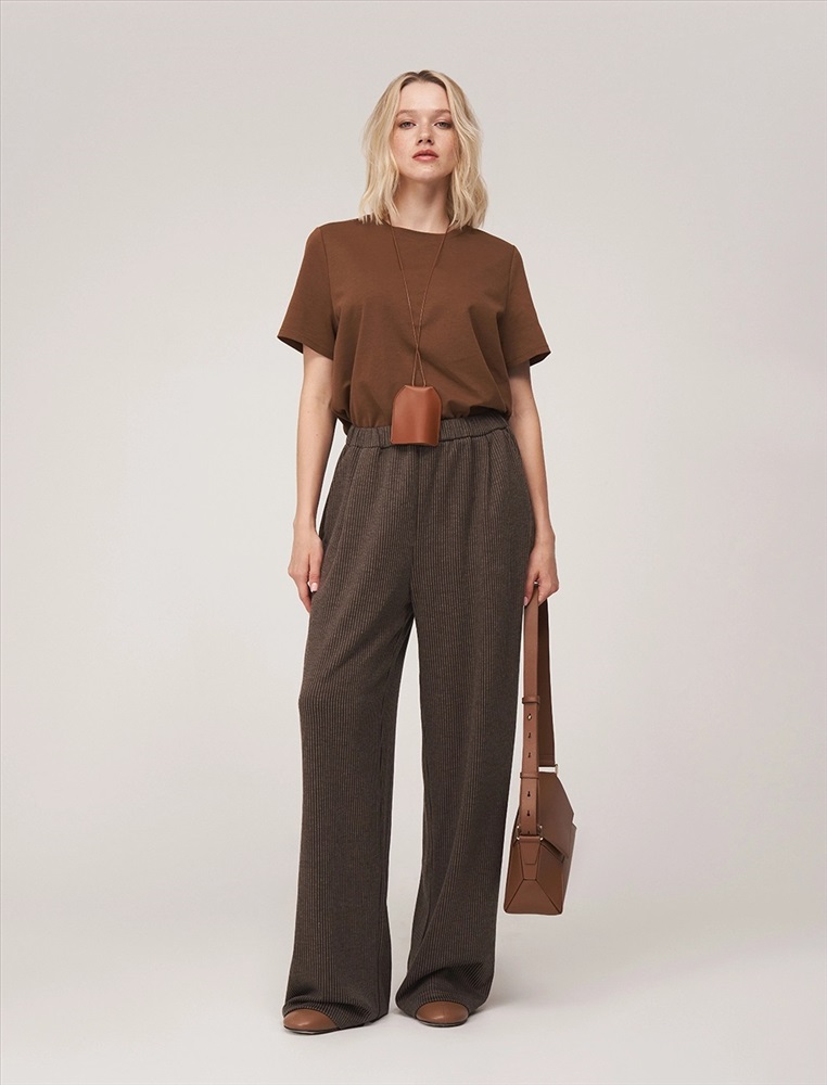 Видео: https-//hassfashion.ru/upload/iblock/ef7/uc565q0qdqgbfh8h5u618mke7bfkhqu2.mp4 осень-зима 80% Хлопок, 15% Район, 5% Спандекс Брюки широкие прямого силуэта. По поясу мягкая резинка. По бокам - карманы. Выполнены из коричневой трикотажной ткани в рубчик, в состав которой входит хлопок, район и спандекс.