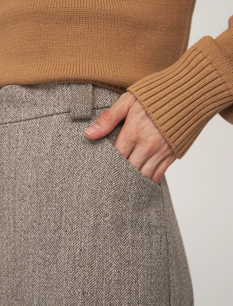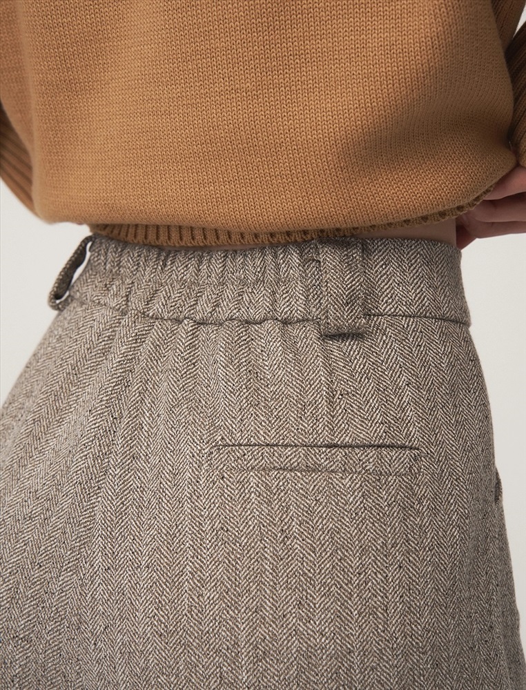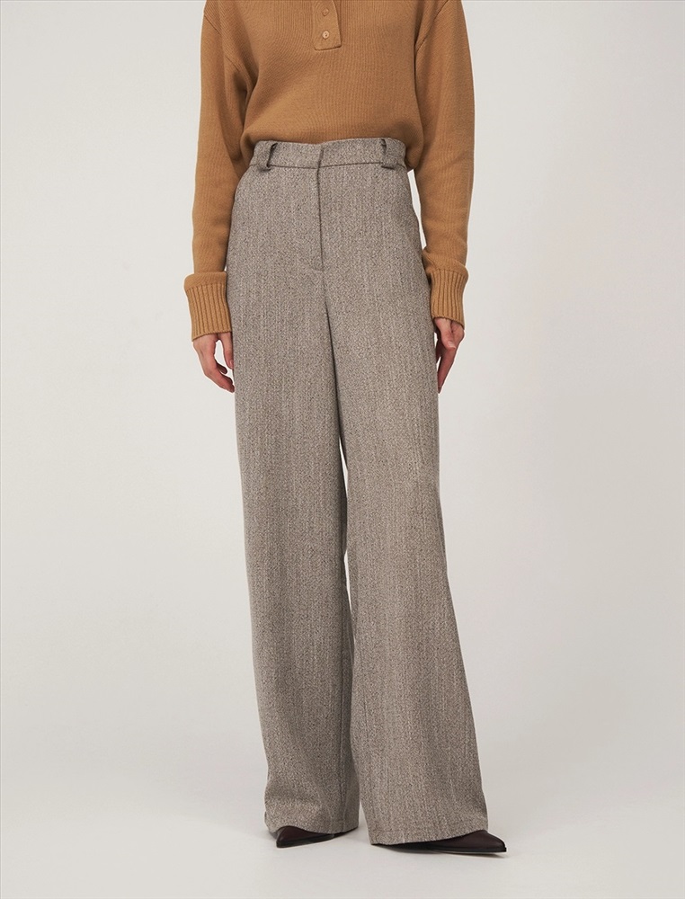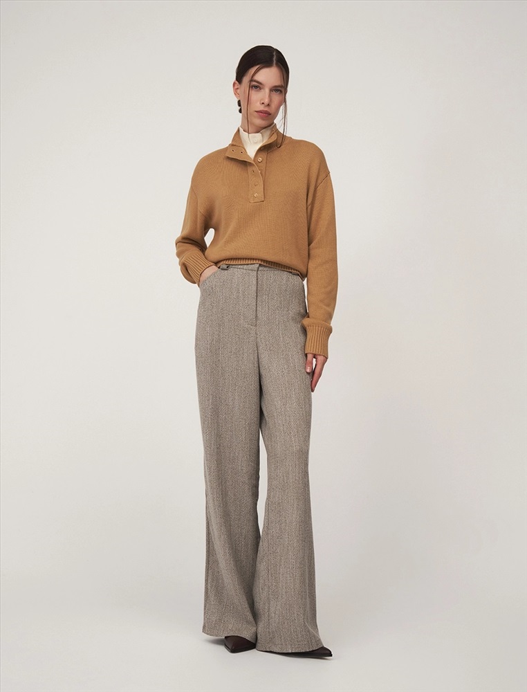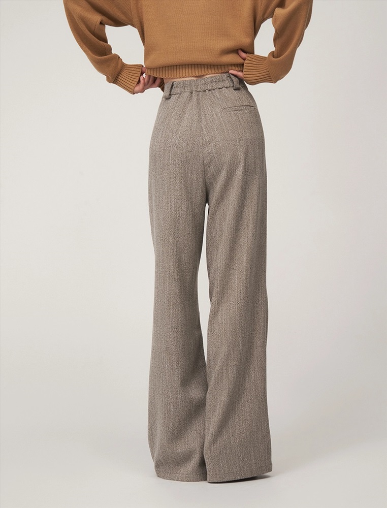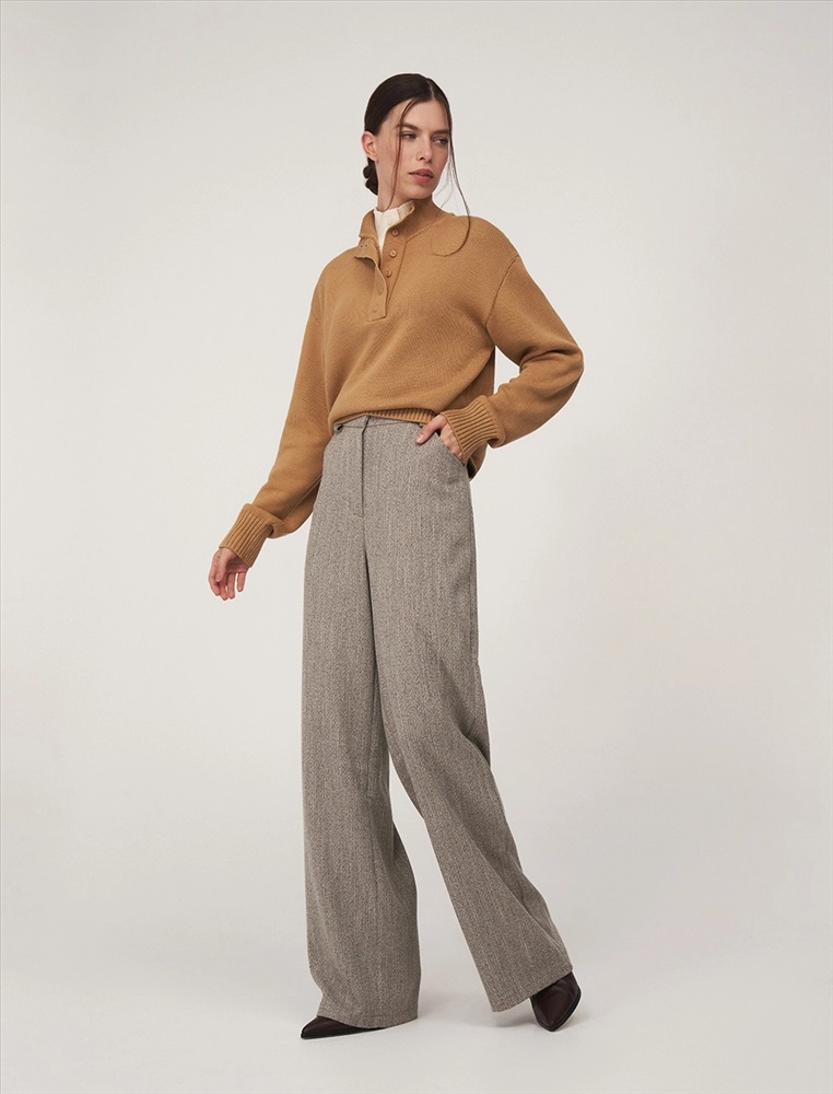 Брюки широкие с посадкой на талии. По поясу расположены широкие шлевки. Спереди гульфик и скрытая застежка. По бокам врезные карманы. Сзади классический карман с листочкой с правой стороны, в пояс встроена эластичная резинка. Выполнены из хлопка (69%), полиэстера и спандекса, что обеспечивает удобство и долговечность.
