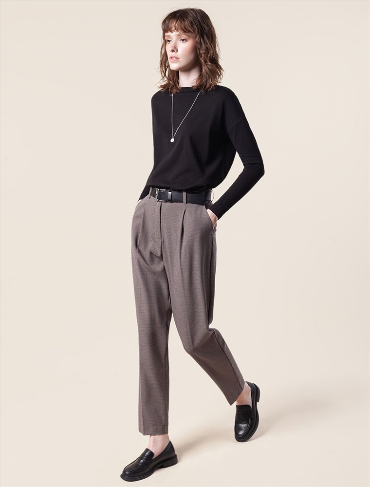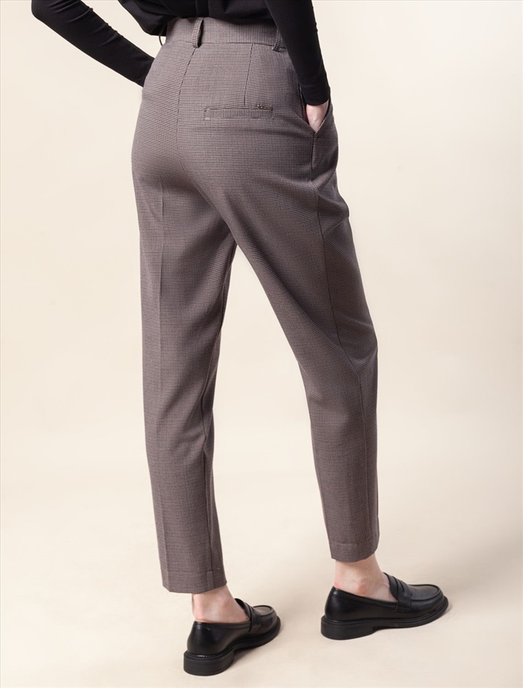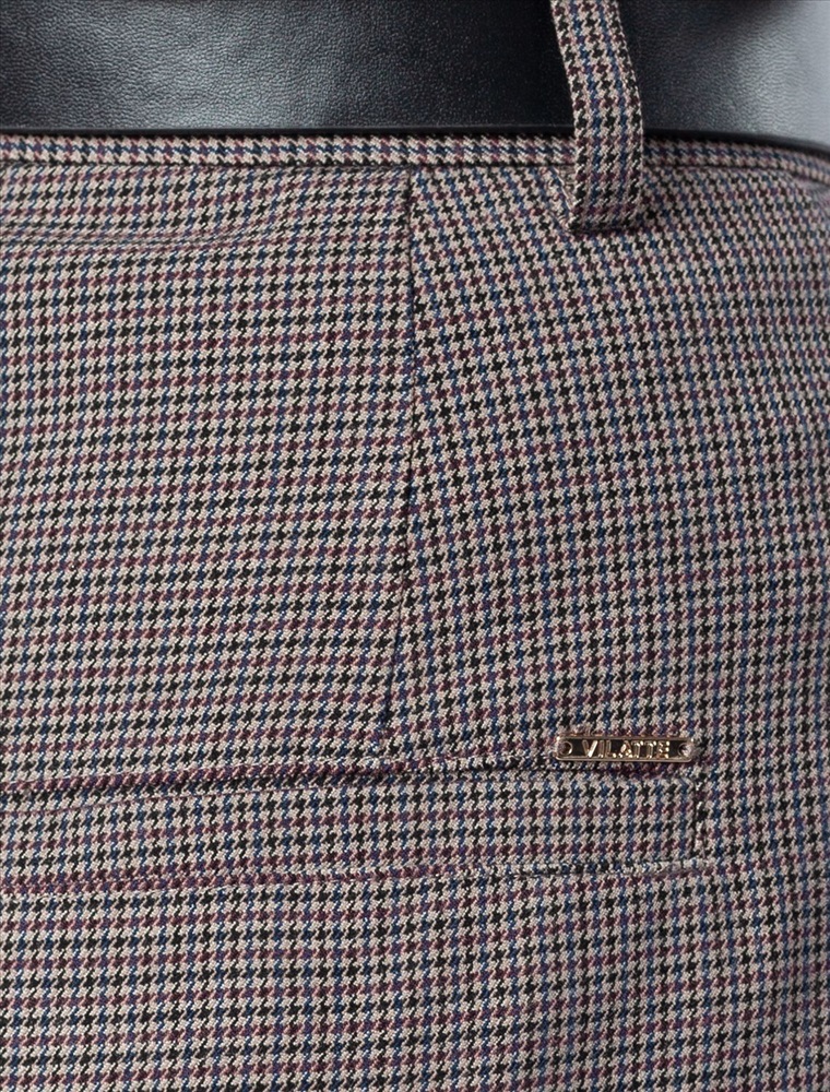 Брюки-бананы в мелкую "лапку" выполнены из поливискозы с добавлением нити эластана. Материал хорошо пропускает воздух, поэтому в изделии не будет жарко даже в отопительный сезон. Комфортная посадка на талии и стрелки визуально вытягивают силуэт. Изделие дополнено защипами спереди и двумя боковыми карманами, одним карманом в листочку сзади. Брюки-бананы отлично подходят обладательницам фигуры песочные часы, а также женщинам с узкими бедрами помогут уравновесить пропорции.