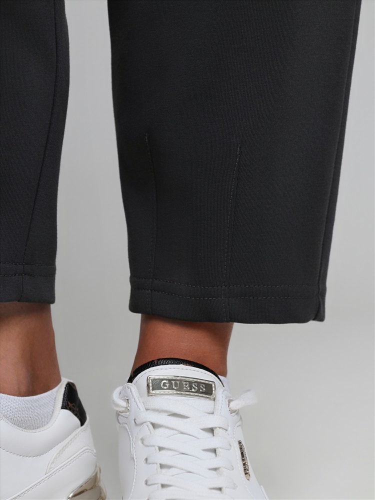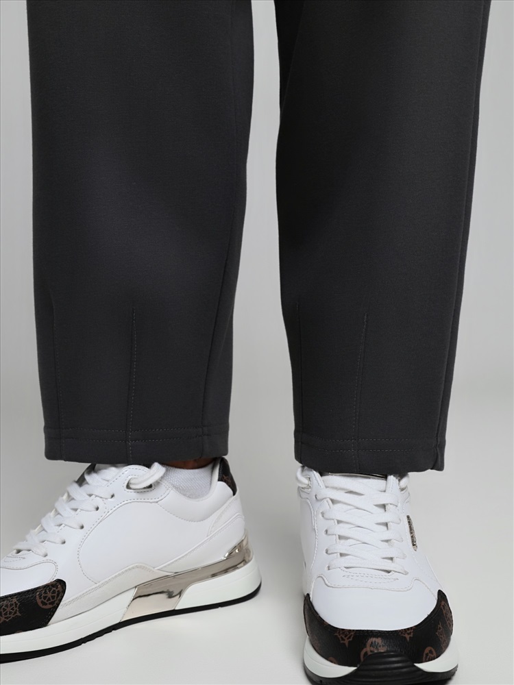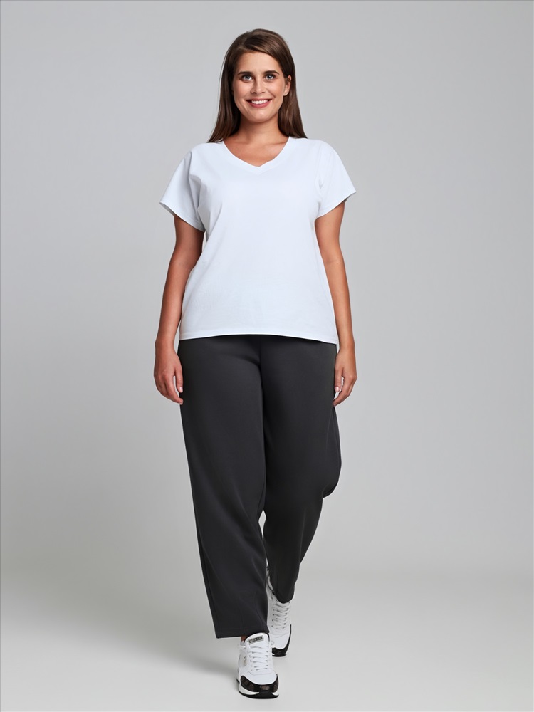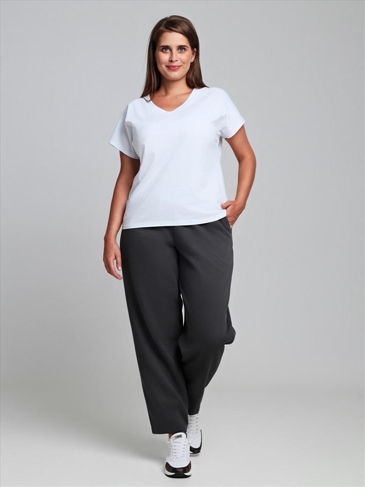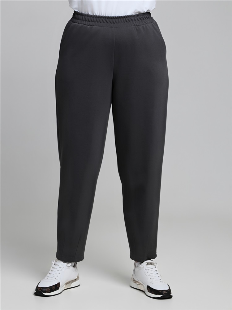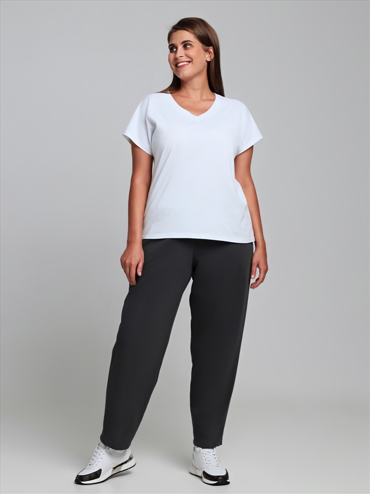Брюки – укороченные, на притачном поясе с эластичной тесьмой внутри и карманами в боковых швах. На нижних частях передних половин застрочено по две вертикальных складочки-защипа.