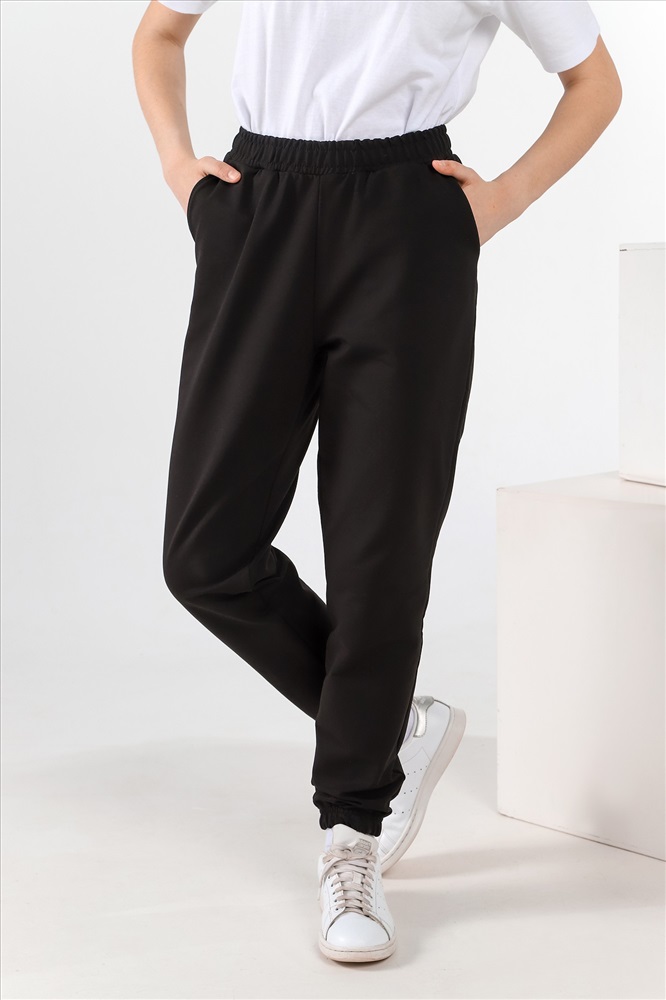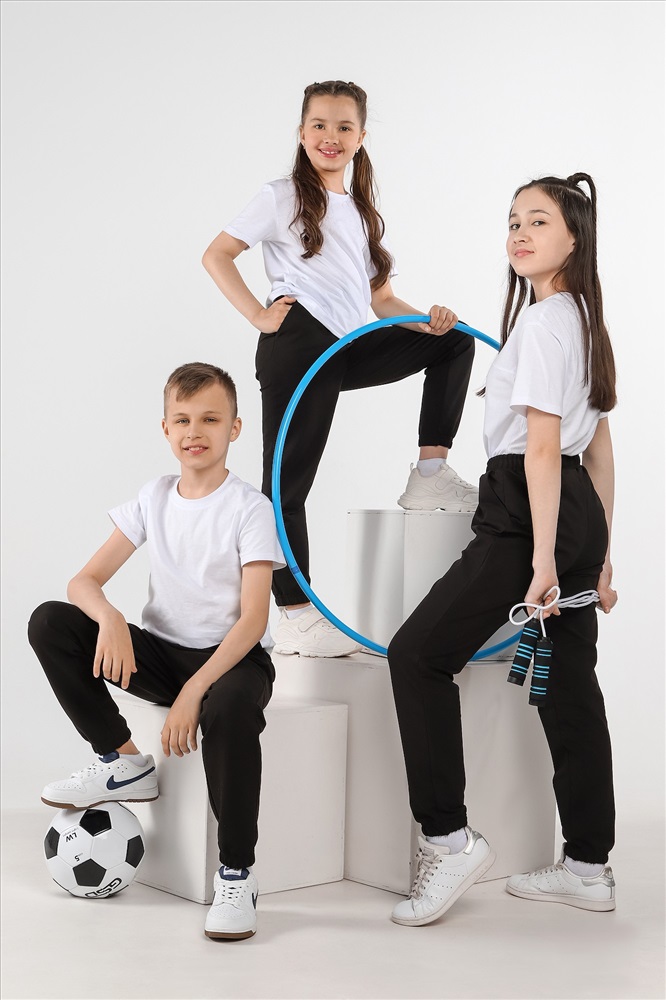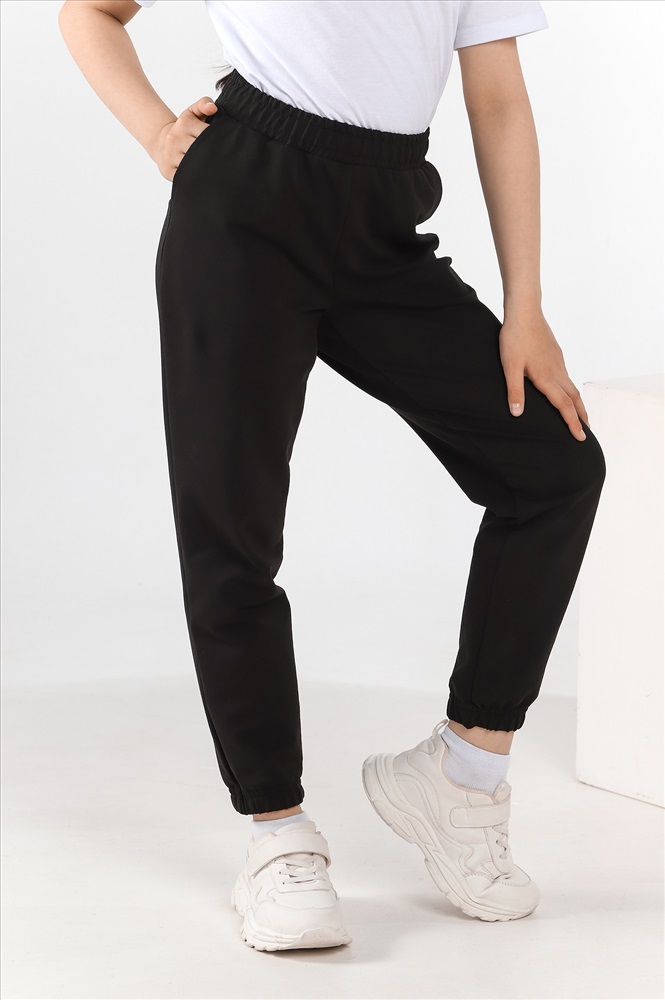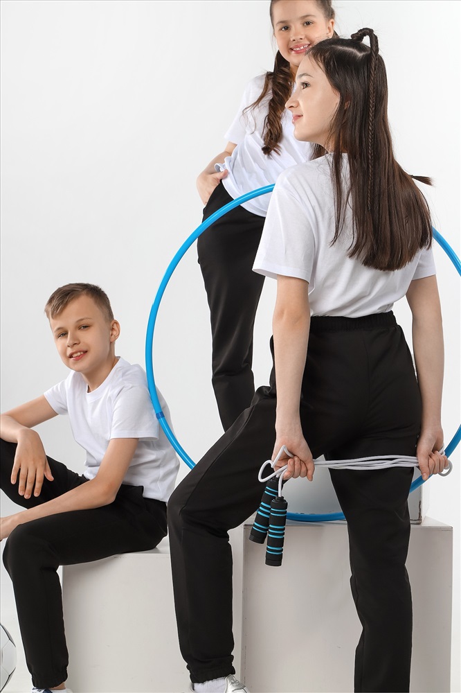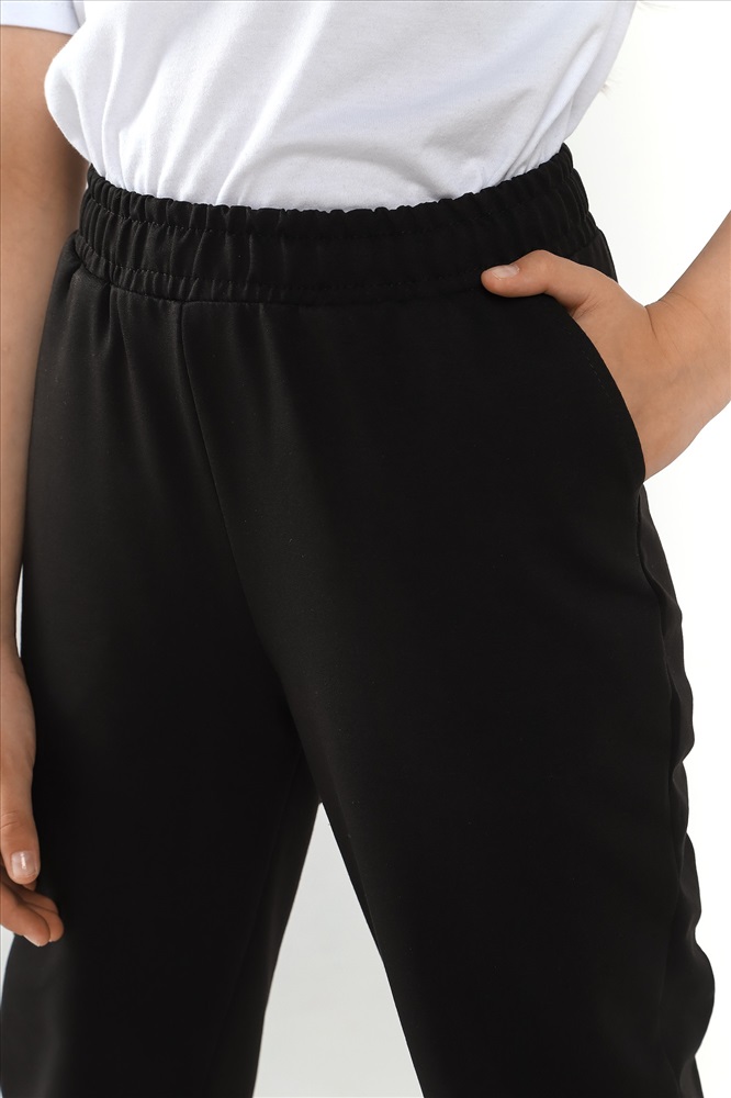 Базовые брюки из футера с лайкрой для девочки. Модель с боковыми карманами, на притачном поясе с отстроченной эластичной тесьмой и внутренним шнуром для регулировки плотности посадки на талии. Низ брючин с эластичной тесьмой.