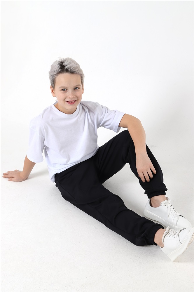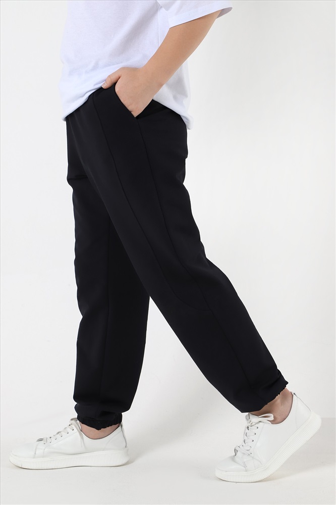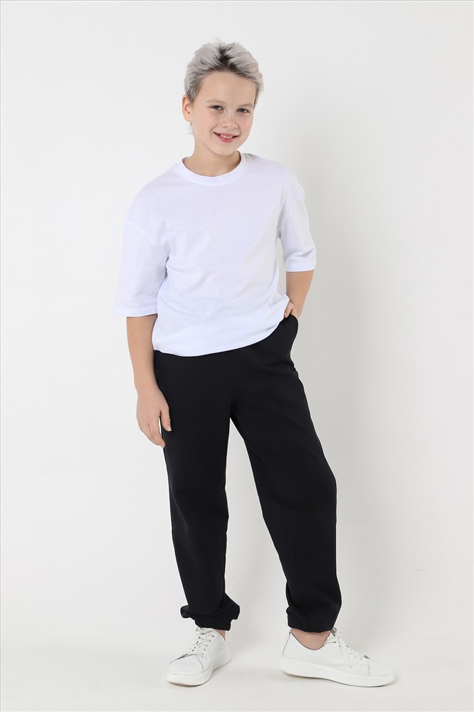 Ткань: Футер 2-х нитка с лайкрой Брюки для мальчика изгладкокрашеного полотна "футер-двухнитка", на притачном поясе с эластичной тесьмой внутри и карманами в боковых швах. Средние половинки - из двух частей каждая, с отделочными строчками по швам стачивания. Нижние срезы обработаны подгибкой сэластичной тесьмой.