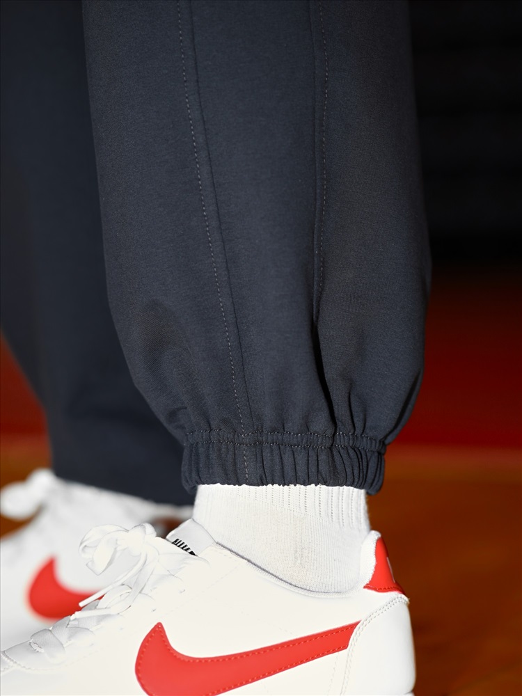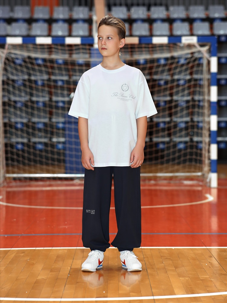 Брюки для мальчика из трикотажного полотна "футер-двунитка" на притачном поясе с эластичной тесьмой внутри, декоративными вставками в боковых швах и карманами, обработанными в соединительных швах передних половин с декоративными вставками. Нижние срезы брюк обработаны с эластичной тесьмой. По швам втачивания вставок и входам в карманы настрочены отделочные строчки. Через петлю пояса продет шнрок, позволяющий регулировать степень прилегания изделия по талии.