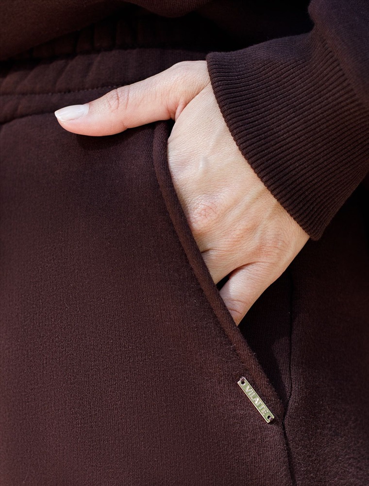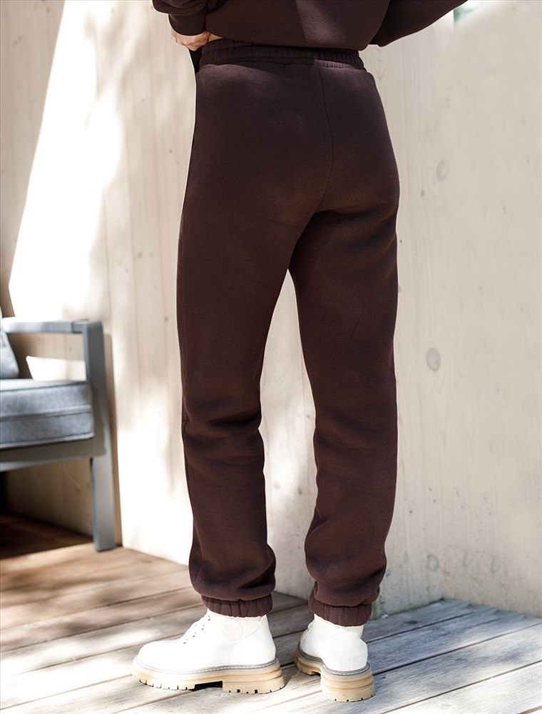 Плотность: 320 Г/м2 Размер товара на первом фото: 42 Сочетается с артикулами: D49.102, D49.103, D49.062 Теплые джоггеры с удобным поясом на резинке и карманами по бокам выполнены из премиального футера-трехнитки. Наличие эластана в составе гарантирует комфорт и долговечность изделия, материал хорошо пропускает воздух, позволяя телу дышать, а мягкий начес обеспечивает дополнительное тепло и комфорт в прохладную погоду. Эти уютные брюки актуального коричневого цвета созданы для вашего комфорта. Стильные спортивные штаны из натурального материала и правильного кроя подойдут для девушек и женщин любого размера, в том числе на плюс-сайз фигуру. Зауженные к низу брюки отлично вытянут силуэт и скроют недостатки за счет правильного кроя. Идеальный выбор для прогулок, отдыха или занятий спортом. В повседневных трикотажных брюках вы будете чувствовать себя комфортно и уверенно, наслаждаясь каждым моментом дня. Комментарии к товару