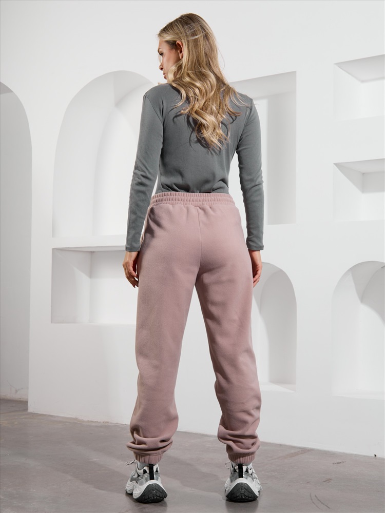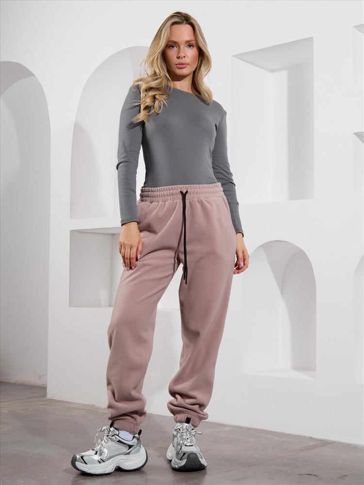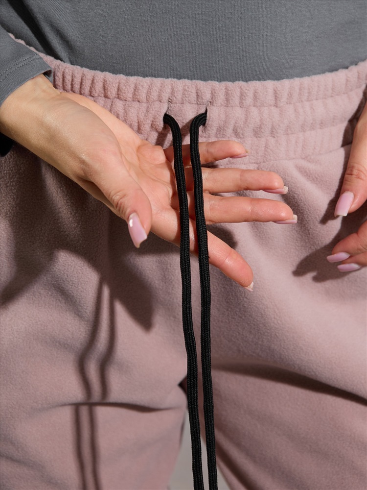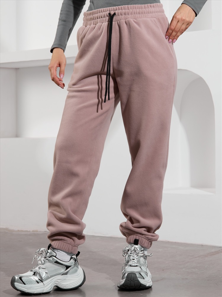 Брюки молодежные из трикотажного гладкокрашенного полотна «флис», длинные, на притачном поясе с эластичной тесьмой внутри и шнурком, продетым через две петли в центре пояса, с карманами в боковых швах и эластичной тесьмой по низу.