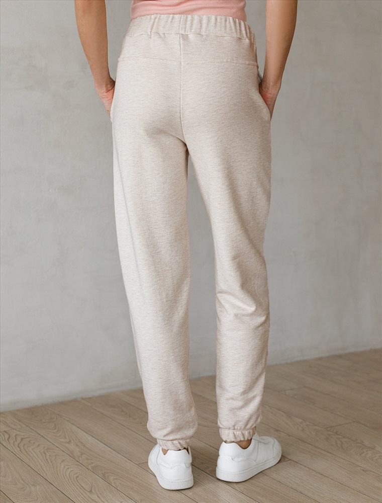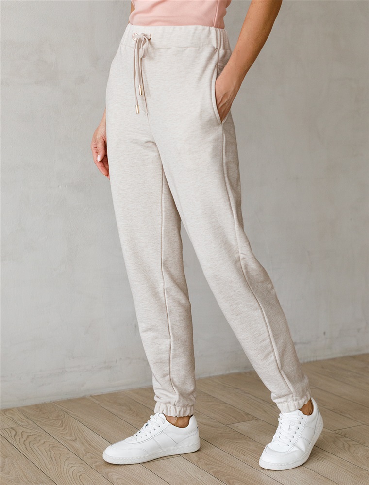 Брюки выполнены из премиального футера трехнитки без начеса. Модель дополнена эластичным поясом на резинке и хлопковым шнурком с золотистой фурнитурой. По бокам два кармана. Наличие эластана в составе гарантирует формоустойчивость и износостойкость изделия. Изделие сочетается в костюме с худи D49.049