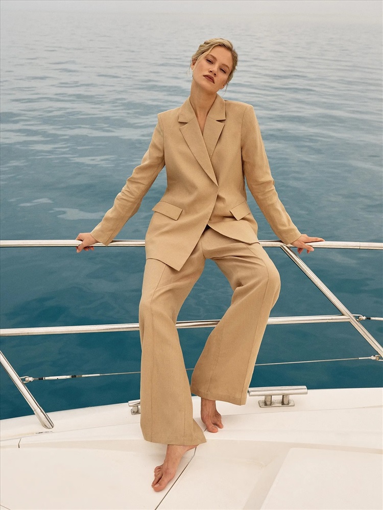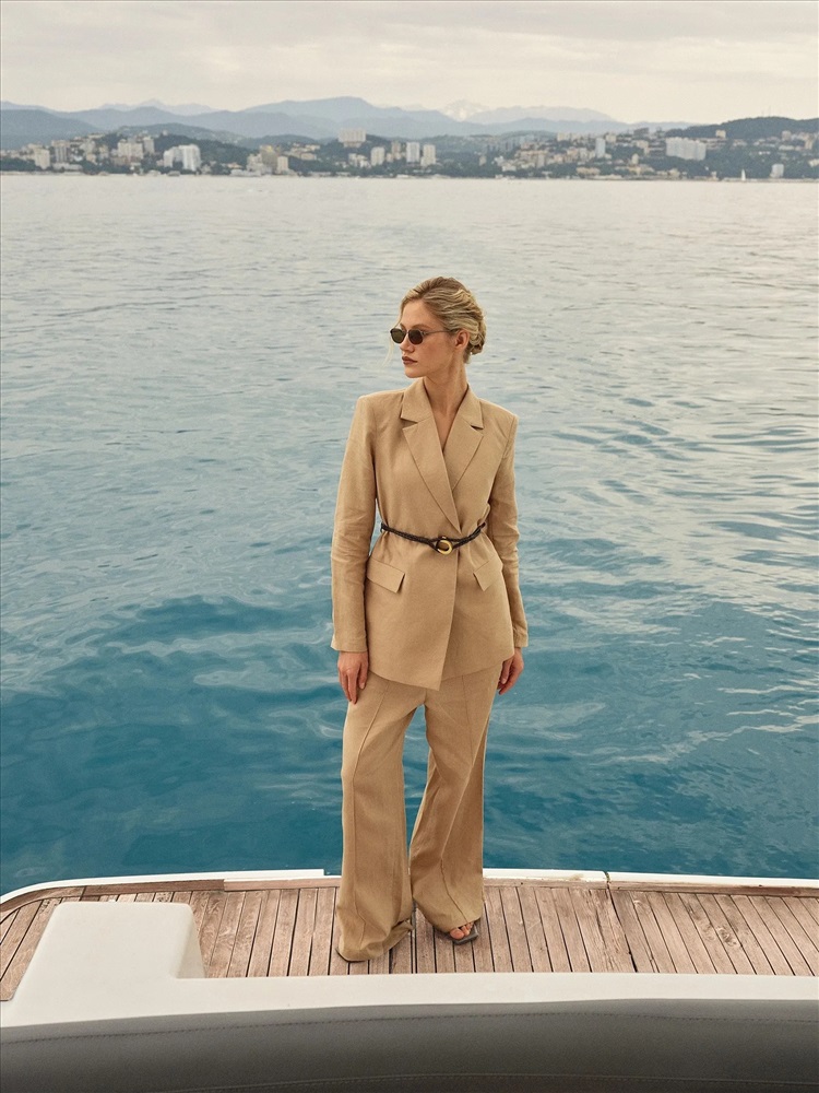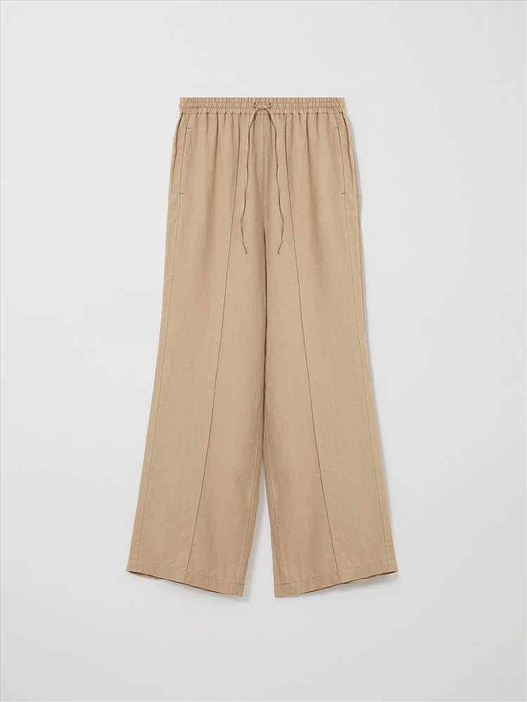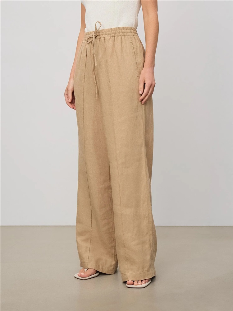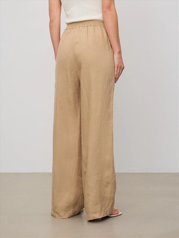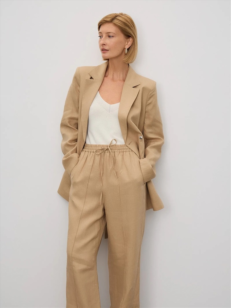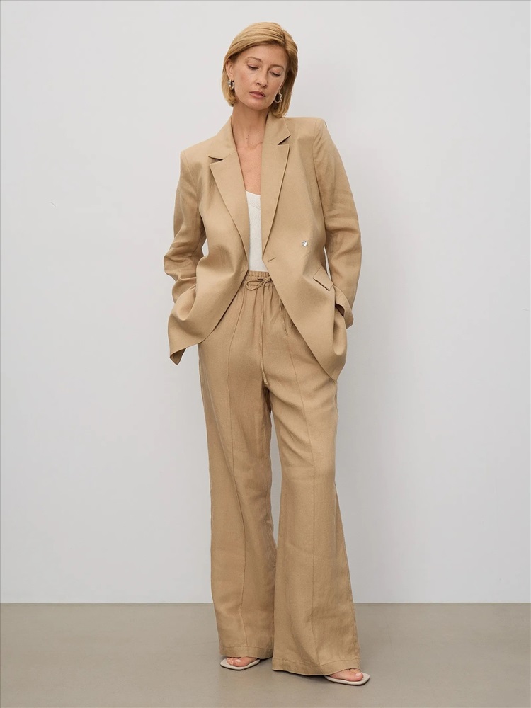 Комфортные брюки изо льна в бежевом цвете одинаково хорошо подходят для дома и на выход. Модель высокой посадки выполнена на широкой резинке с завязками: очень удобно и позволяет по-разному сажать брюки по фигуре. С жакетом из комплекта брюки можно носить в офис, а дома или на прогулке просто с трикотажным топом или футболкой.