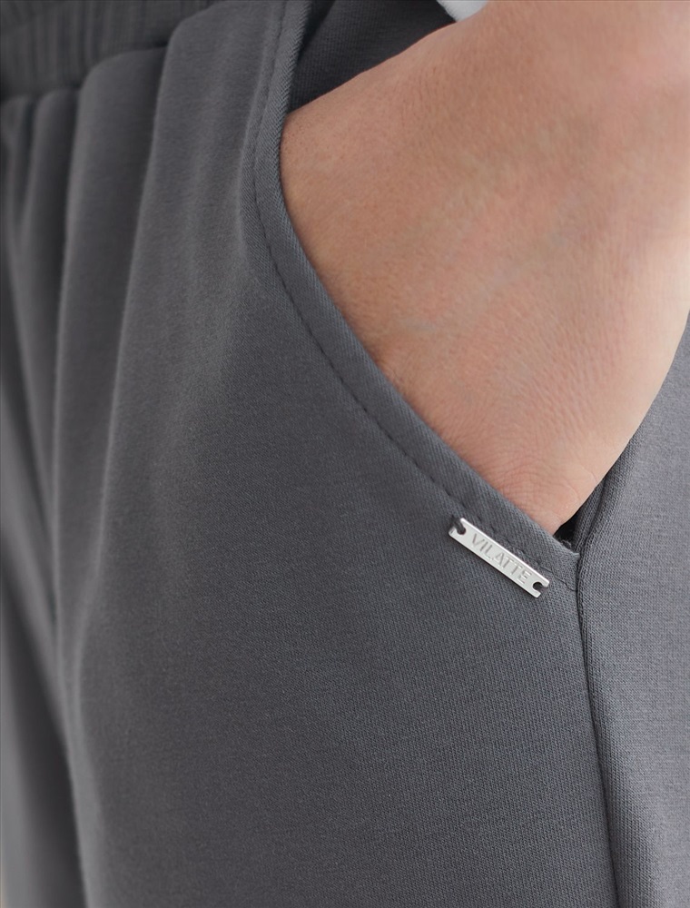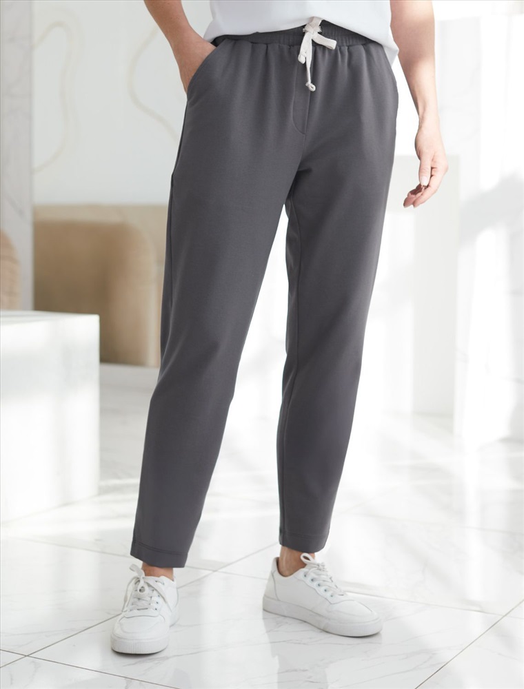 Брюки выполнены из тонкого хлопкового футера. Эластичный материал хорошо пропускает воздух, позволяя телу дышать, и легко тянется, не ограничивая движения. Пояс на резинке дополнен внутренним шнуром, для комфортной регулировки изделия. Брюки сочетаются в костюме с джемпером D49.054 и D49.055