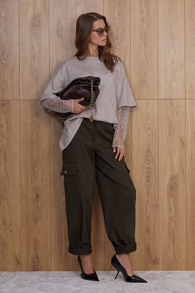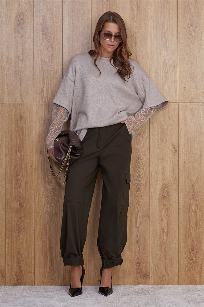 Брюки-карго выполнены из плотного хлопка. Брюки прямые от бедра, на пясе со шлевками. Карманы в боковых швах. Сзади прорезные карманы с листочками – обманки. Объемные накладные карманы-портфели с клапанами по боковым швам.