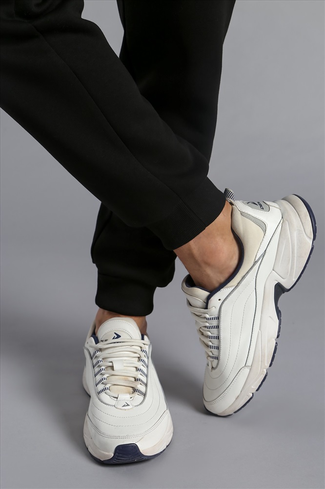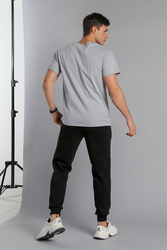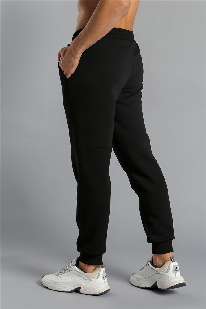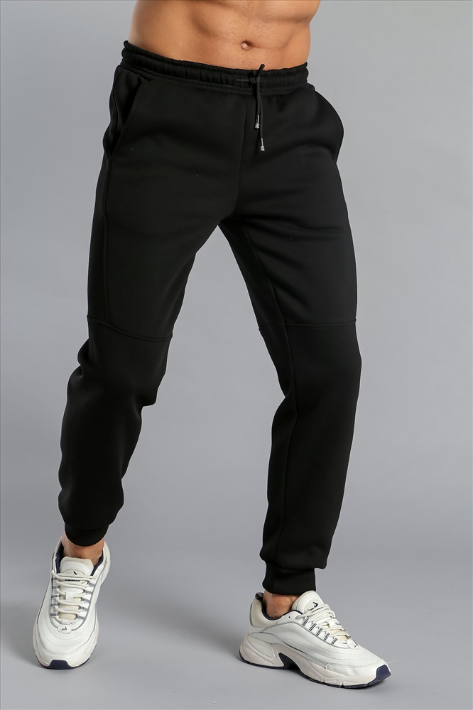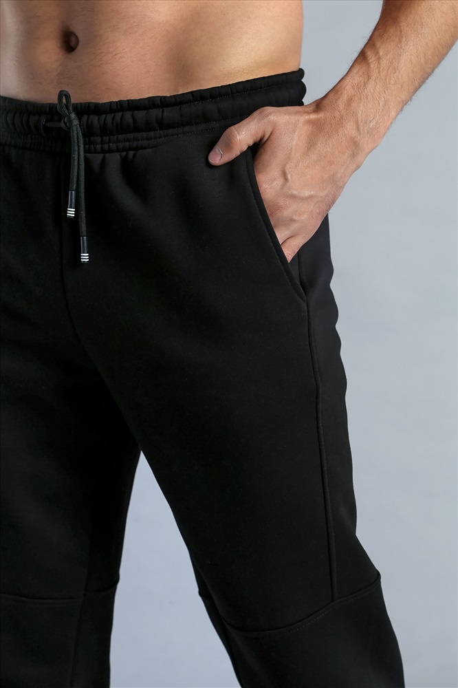 Брюки мужские из футера с начесом. Модель с эффектным членением, с боковыми карманами, на поясе с отстроченной эластичной тесьмой и шнуром.
