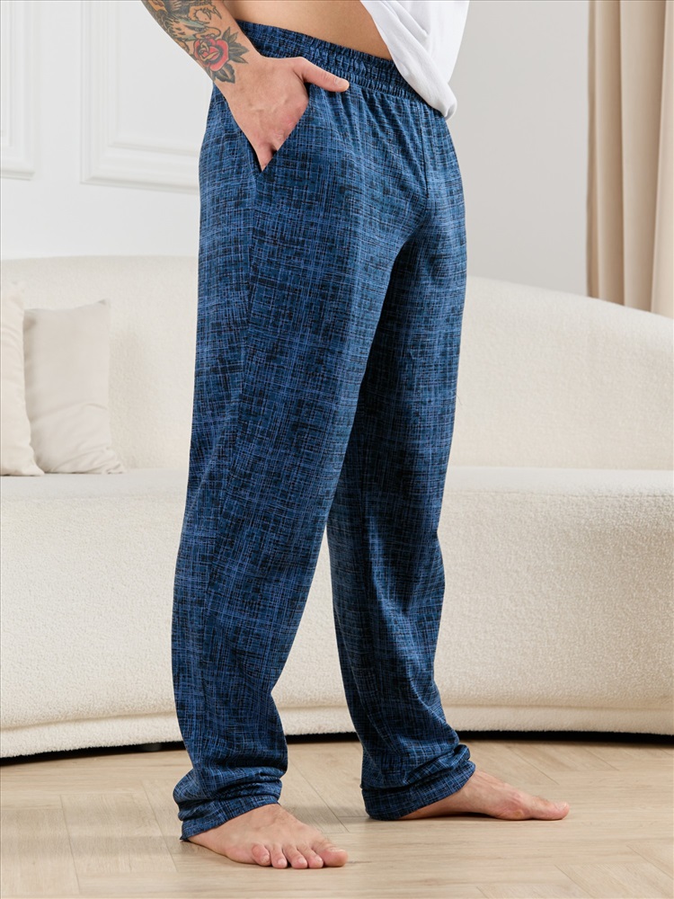 Брюки мужские из трикотажного полотна "кулирка" в клетку, свободного покроя, на притачном поясе с эластичной тесьмой внутри, с карманами в боковых швах. Нижние срезы обработаны подгибкой.