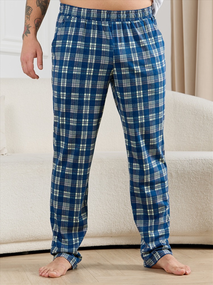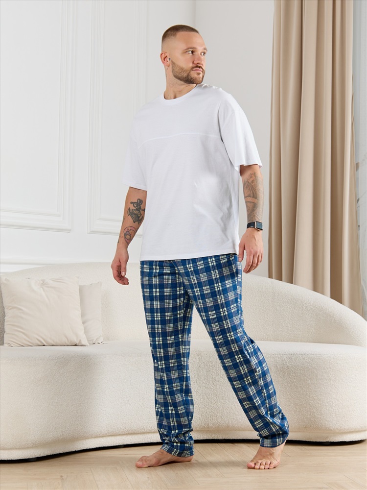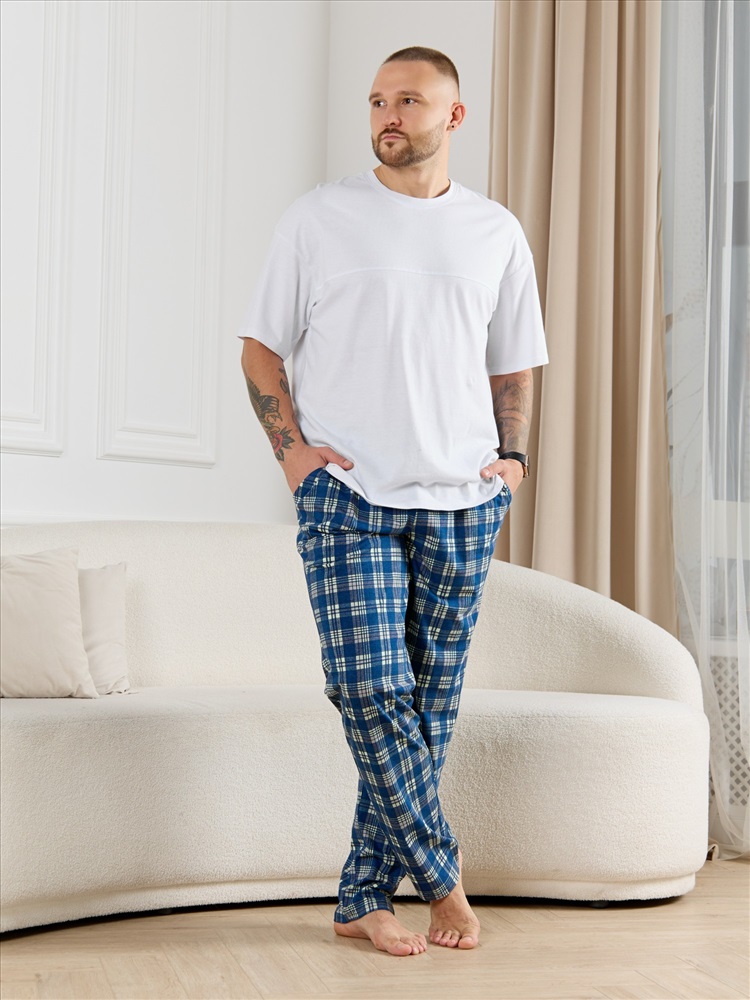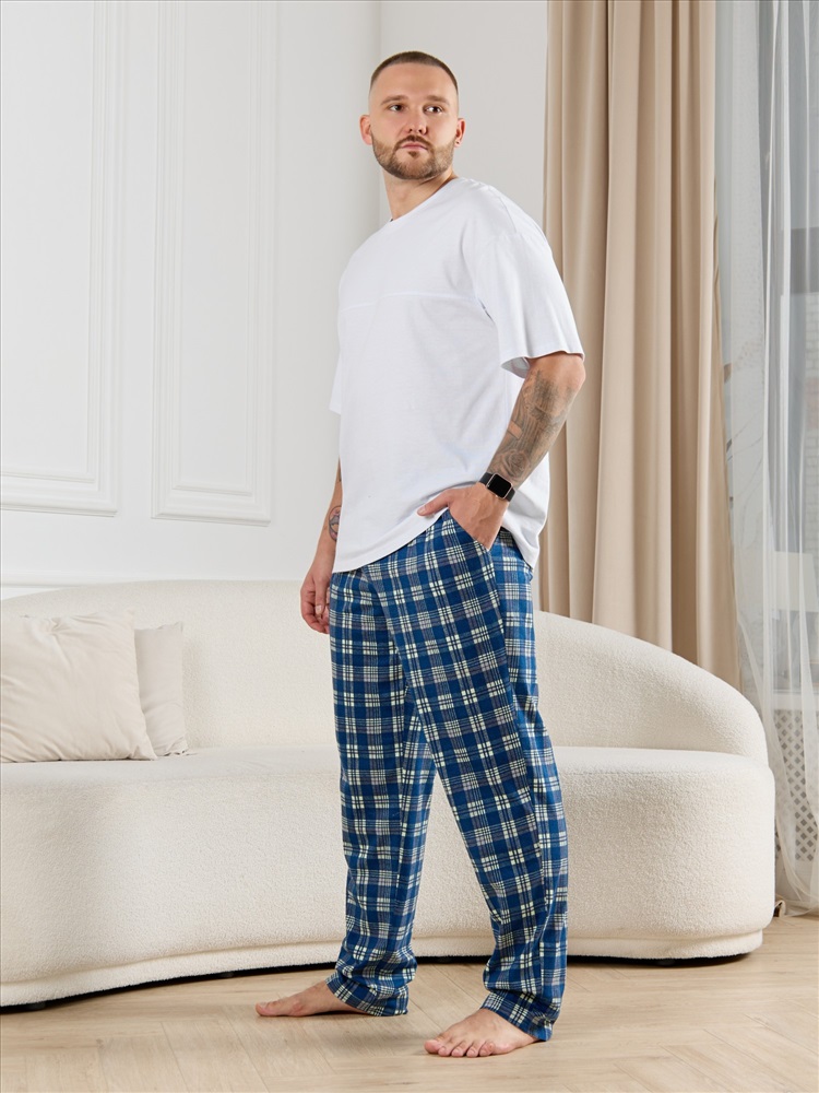 Брюки мужские из трикотажного полотна "кулирка" в клетку, свободного покроя, на притачном поясе с эластичной тесьмой внутри, с карманами в боковых швах. Нижние срезы обработаны подгибкой.
