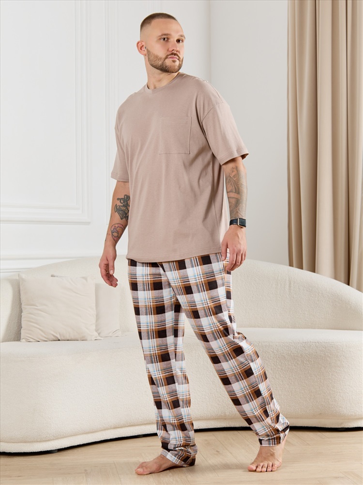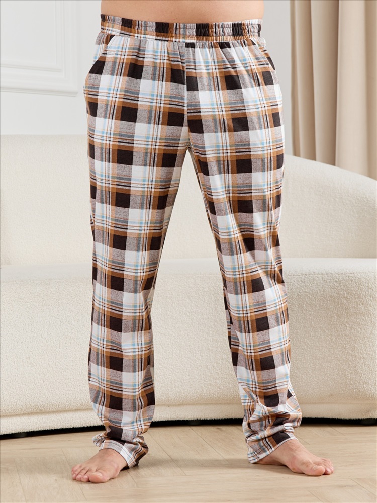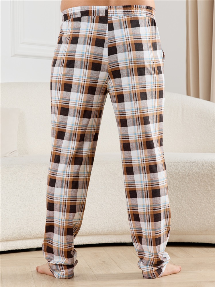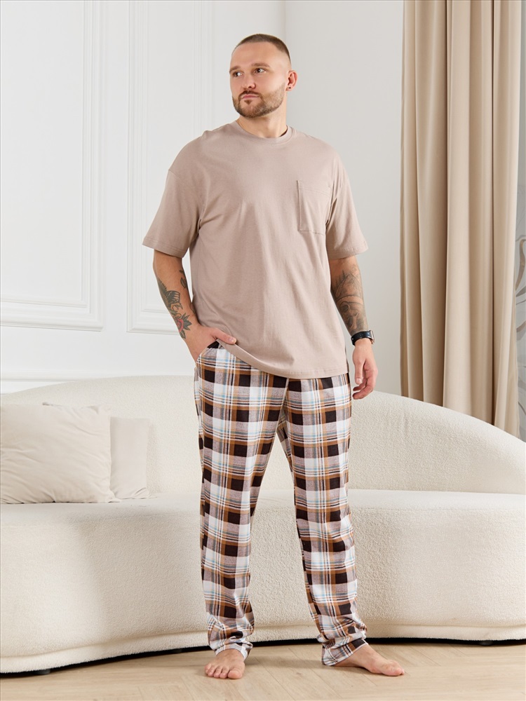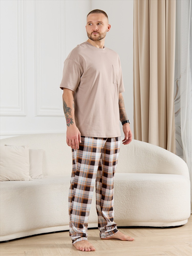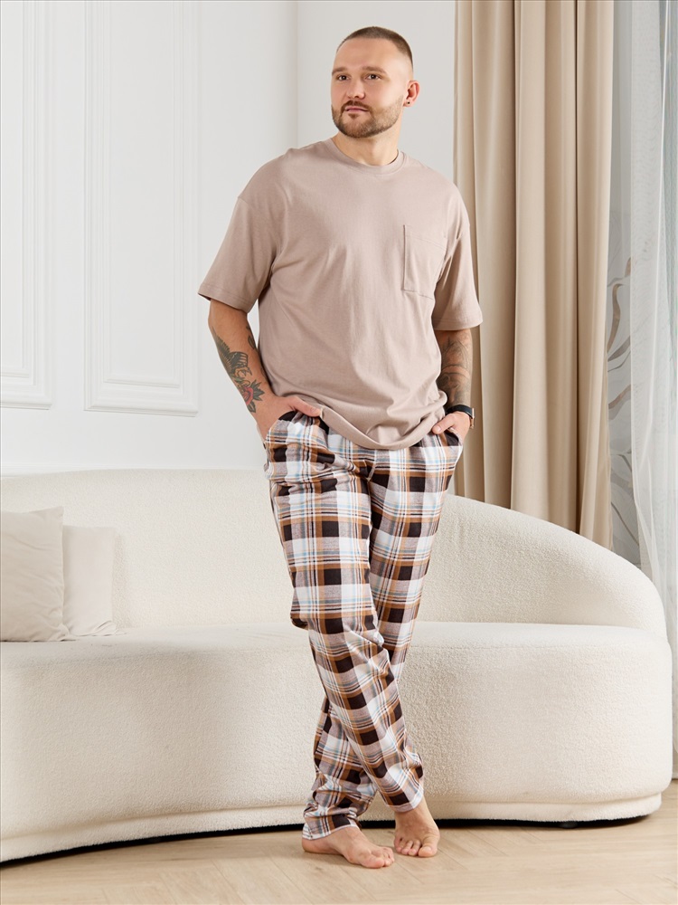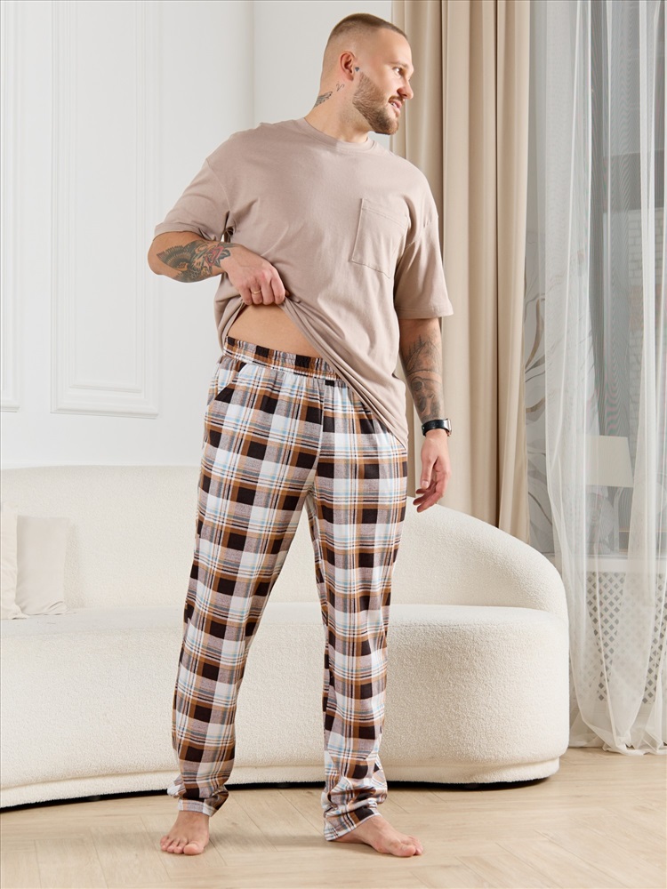 Брюки мужские из трикотажного полотна "кулирка" в клетку, свободного покроя, на притачном поясе с эластичной тесьмой внутри, с карманами в боковых швах. Нижние срезы обработаны подгибкой.