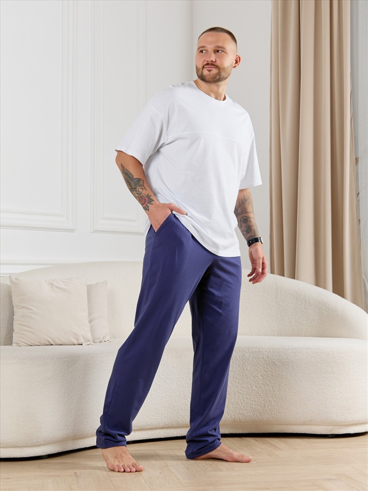 Брюки мужские из гладкокрашенго трикотажного полотна "кулирная гладь", свободного покроя, на притачном поясе с эластичной тесьмой внутри, с карманами в боковых швах. Нижние срезы обработаны подгибкой.