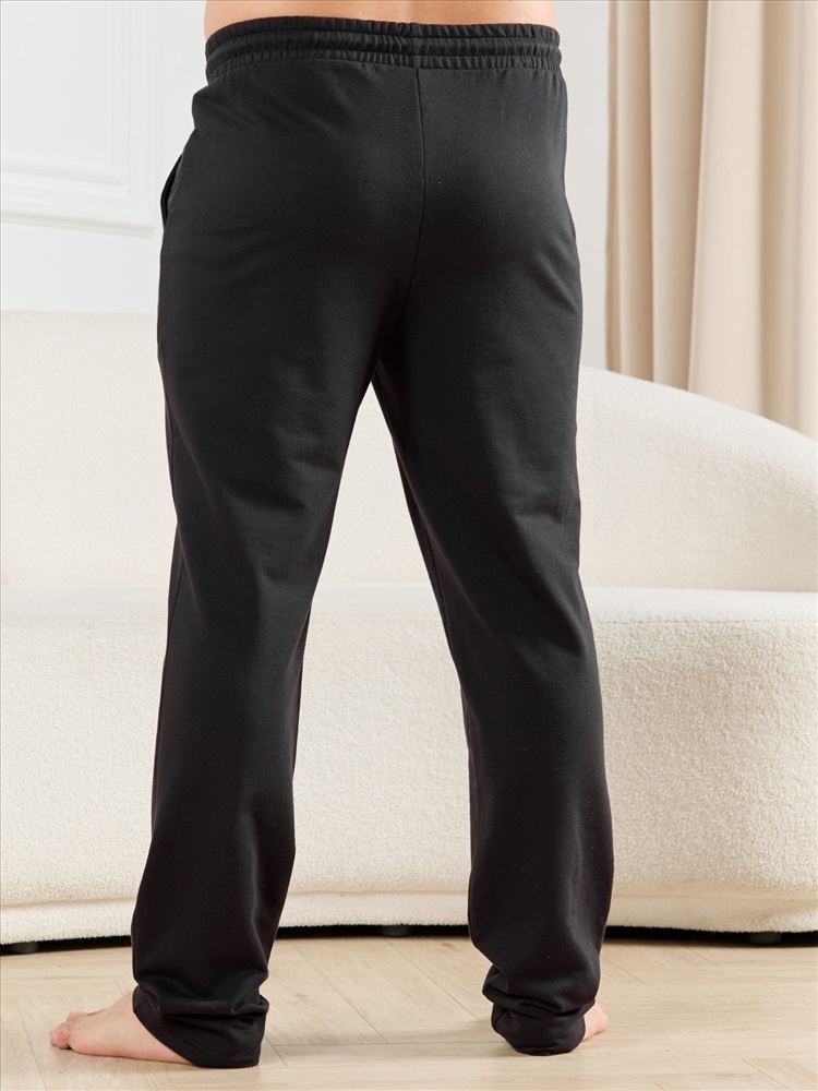 Брюки мужские из гладкокрашенго трикотажного полотна "футер 2-нитка", свободного покроя, на притачном поясе с эластичной тесьмой внутри, с карманами в боковых швах. Нижние срезы обработаны подгибкой.