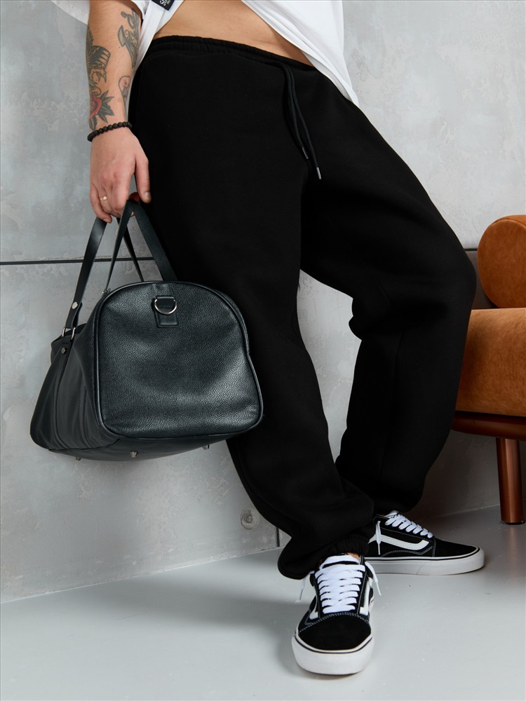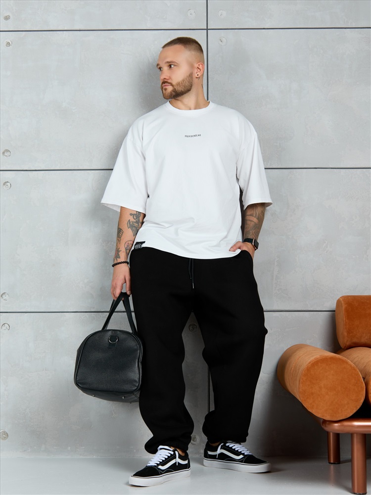 Брюки мужские из трикотажного полотна "футер-3-нитка с начесом", на притачном поясе с эластичной тесьмой внутри, с карманами в боковых швах. Нижние срезы обработаны подгибкой с эластичной тесьмой. Для регулирования степени прилегнания изделия по линии талии предусмотрен декоративный шнурок, вставленный в пояс и продетый через две обметанные петли в центре.