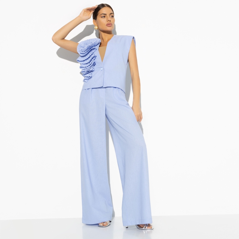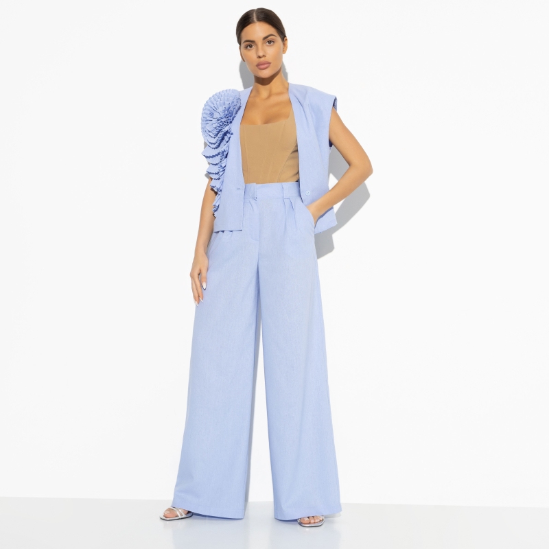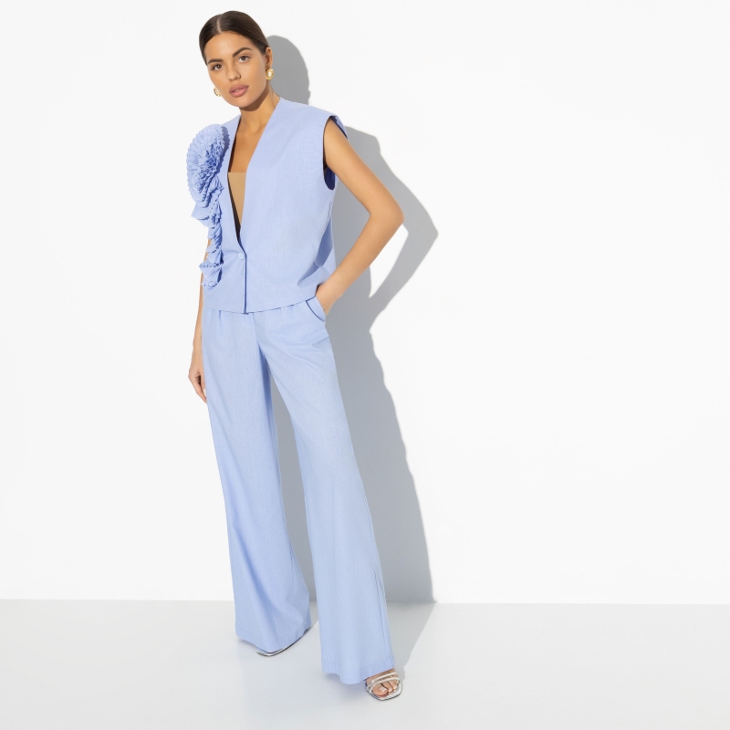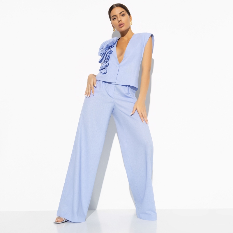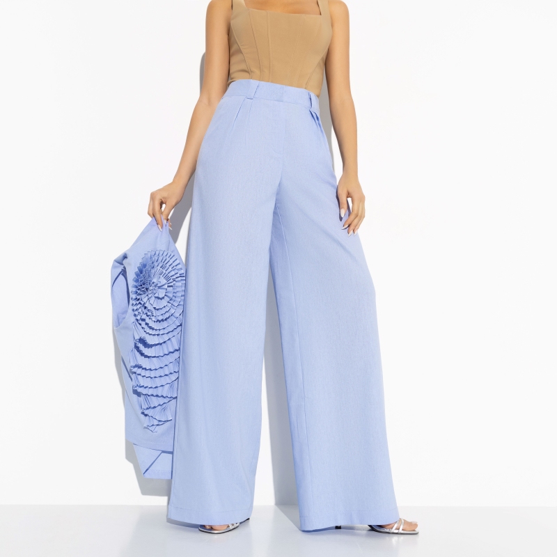 Состав: «Лён блури» (40% полиэстер, 27% вискоза, 23% лён, 10% хлопок) Плотность ткани: Средняя Тип ткани: Текстиль Вид застежки: Крючок, молния Карманы: В боковом шве Основной цвет ткани: Голубой Отрезная талия: Нет Подклад: Нет Резинка по талии: Нет Рисунок/раппорт: Нет, все изделия идентичны Сезон: Лето Силуэт: Свободный Стиль: Классический Фасон брюк: Классические Фасон брюк: Классические Параметры модели на фото: