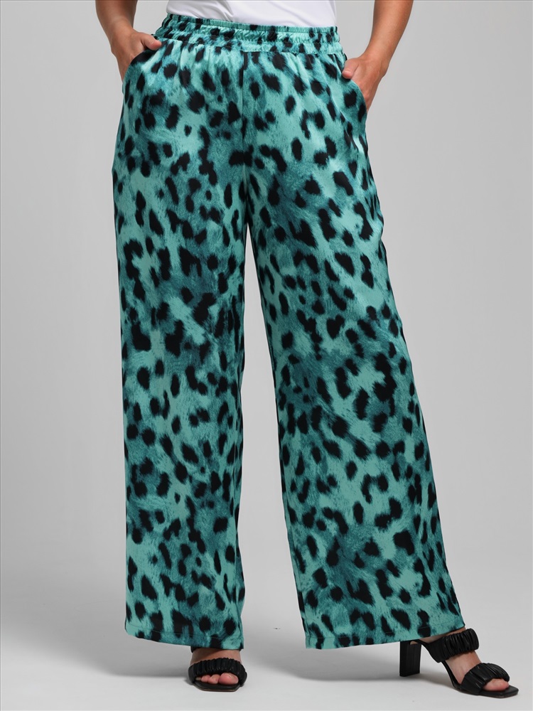 Брюки женские из тканого полотна «искусственный шёлк полиэстер» с набивным рисунком, длинные, свободные, с карманами в боковых швах, на притачном поясе с эластичной тесьмой внутри.