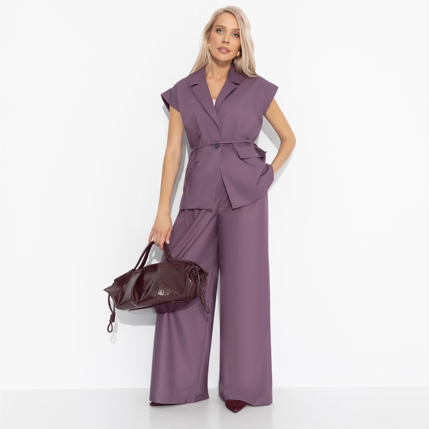 Состав: «Поливискоза» (85% п/э, 15% вискоза) Плотность ткани: Средняя Тип ткани: Текстиль Вид застежки: Пуговица/-ы, молния Высота посадки: Высокая Карманы: В боковом шве Основной цвет ткани: Бордовый Отрезная талия: Есть Подклад: Нет Резинка по талии: Есть Рисунок/раппорт: Нет, все изделия идентичны Сезон: Круглогодичный Стиль: Повседневный Фасон брюк: Палаццо Фасон брюк: Палаццо Параметры модели на фото: