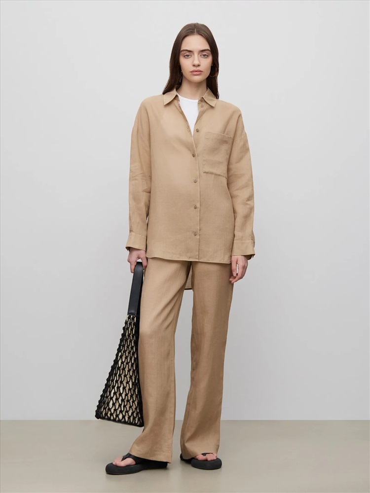 Приятные к телу брюки из рами станут отличным выбором на каждый день. Натуральный материал на основе крапивы даёт легкость, защищает от перегрева, не электризуется и устойчив к износу. Бежевый цвет универсален и стильно смотрится. Модель высокой посадки выполнена на широкой резинке с завязками: очень удобно и позволяет по-разному сажать брюки по фигуре.