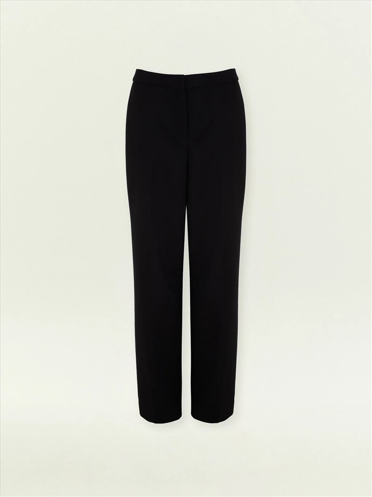Чёрные брюки для классических офисных образов. Модель прямого кроя имеет среднюю посадку. Застёгивается на молнию и потайную застёжку. Завершить образ можно жакетом из комплекта.