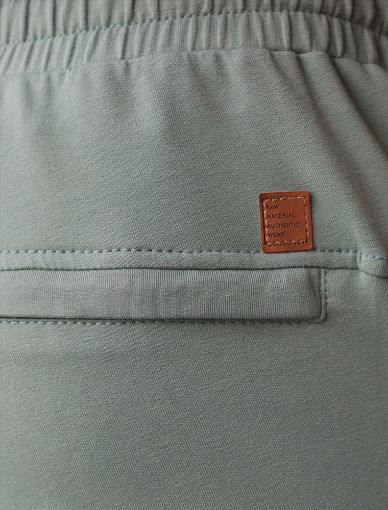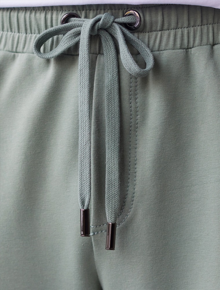 Свободные брюки светло-оливкого цвета с эластичным поясом на резинке и шнуром с металлическим наконечником изготовлены из премиального футера двухнитки. Натуральная ткань, в составе которой хлопок и эластан, отличается дышащими свойствами и мягкостью на ощупь, обеспечивает комфорт и удобство в повседневной носке. Трикотажные брюки сохраняют свой первоначальный вид после многочисленных стирок, что делает их практичными для активного использования. Повседневные брюки дополнены карманами по бокам и одим задним карманом на молнии, что позволяет удобно хранить необходимые мелочи. Внизу расположены затяжки на стопорах, тем самым можно регулировать посадку под индивидуальные предпочтения каждого мужчины.