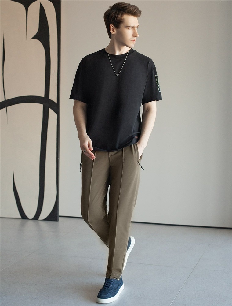 Плотность: 240 Г/м2 Размер товара на первом фото: 42 Свободные джоггеры цвета хаки созданы для максимального комфорта на каждый день. Брюки выполнены из натуральной ткани — премиального футера двухнитки, дополнены эластичным поясом со шнуром, двумя карманами на молнии по боками и задним карманом с минималистичной вышивкой в тон брюкам. Перевод надписи Wanderlust - Страсть к путешествиям . Брюки визуально вытягивают силуэт за счет декоративных застроченных стрелок. Эластичный качественный хлопок обеспечивает приятное ощущение, прилегая к телу, а также позволяет коже дышать. Ткань отличается высокой износостойкостью, не деформируется после стирки, сохраняет форму и внешний вид даже при активной носке. Повседневные спортивные штаны подходят для любого роста и комплекции благодаря представленной широкой размерной линейке. Подойдут на худых парней и мужчин в теле. Брюки правильного кроя, будут удобными для повседневной носки, не стесняя движений - идеальный выбор для отдыха дома, путешествий, для активной работы или прогулок. Трикотажные зауженные брюки отлично сочетаются с разными стилями одежды: от спортивного до кэжуал, с футболками и свитшотами. Это незаменимые джоггеры в современном гардеробе мужчины. Комментарии к товару