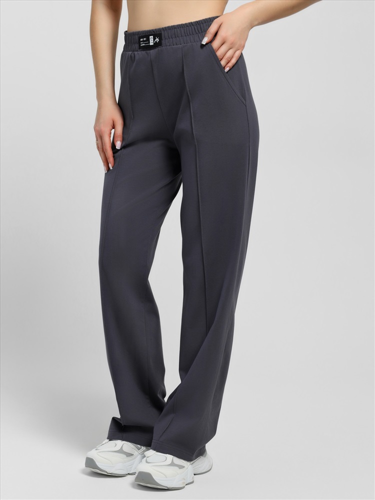 Ткань: Кулирка с лайкрой Брюки – из гладкокрашеного трикотажного полотна "кулирка с лайкрой"длинные, классического кроя, на притачном поясе с эластичной тесьмой внутри и карманами в боковых швах. Передние половины брюк застрочены по центральным линиям. По центру пояса настрочен декоративный элемент