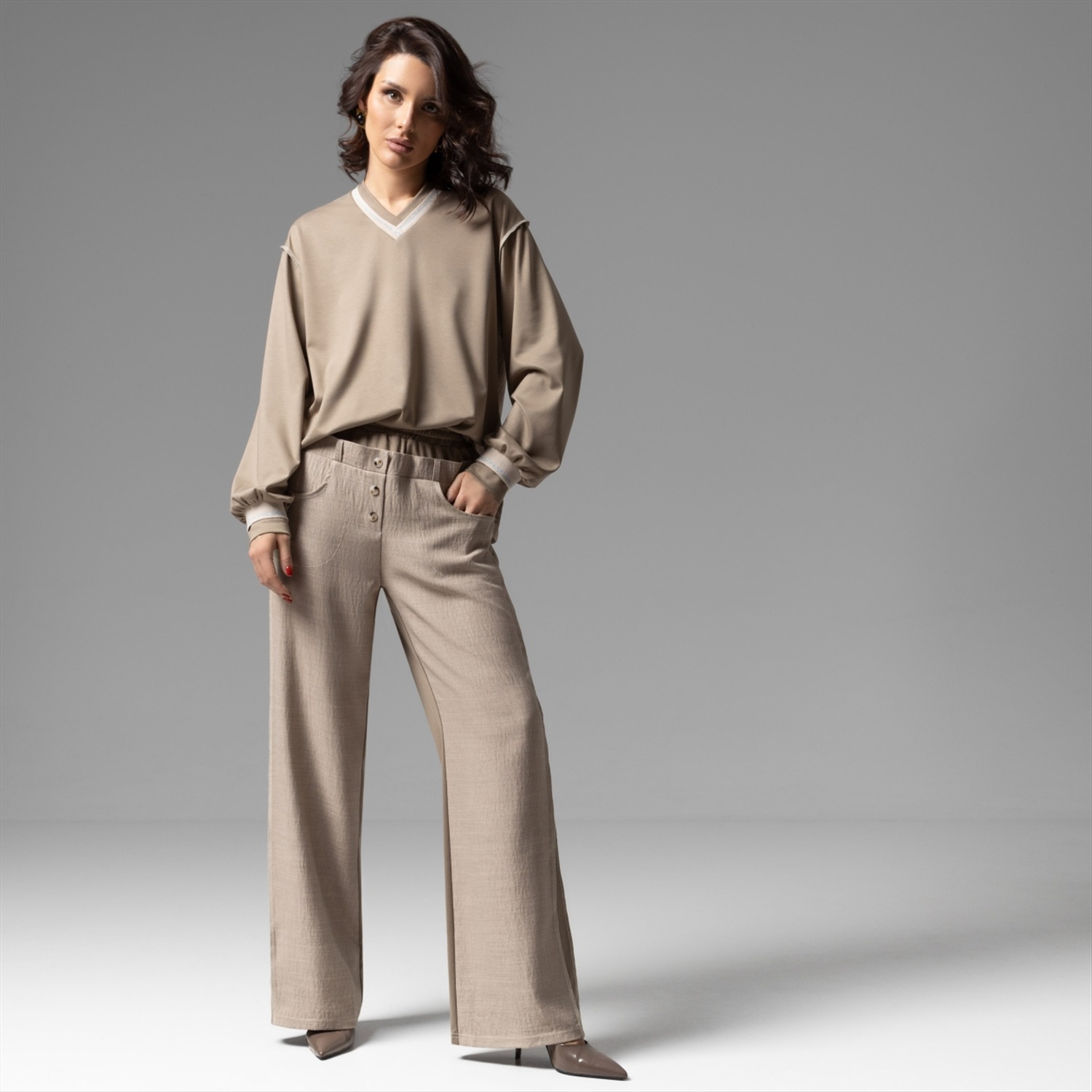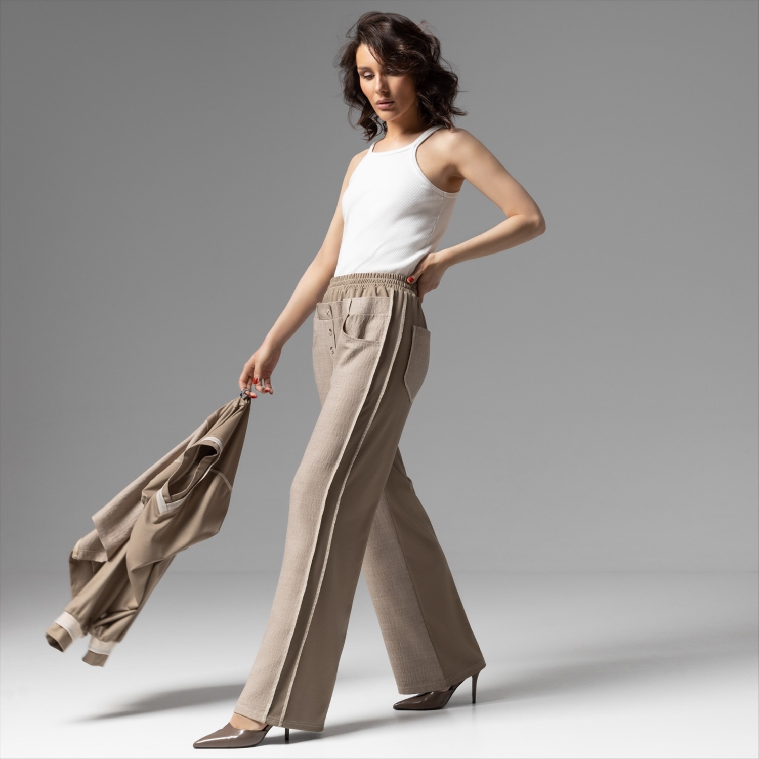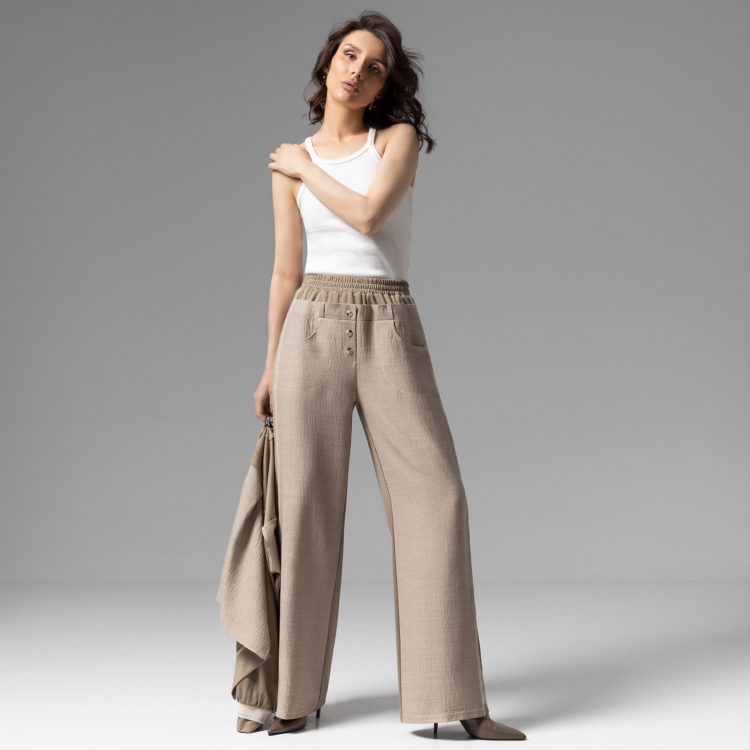 Состав: Костюмная ткань «люсан», трикотаж «милано» + трикотаж подклад (65% полиэстер, 30% вискоза, 5% спандекс) Плотность ткани: Средняя Тип ткани: Трикотаж, текстиль Вид застежки: Нет Высота посадки: Высокая Декоративные элементы: Другое Дополнительный цвет ткани: Бежевый Карманы: Накладные Основной цвет ткани: Бежевый Отрезная талия: Есть Подклад: Есть Резинка по талии: Есть Рисунок/раппорт: Нет, все изделия идентичны Сезон: Круглогодичный Силуэт: Свободный Стиль: Повседневный Фасон брюк: Широкие Фасон брюк: Широкие Параметры модели на фото: