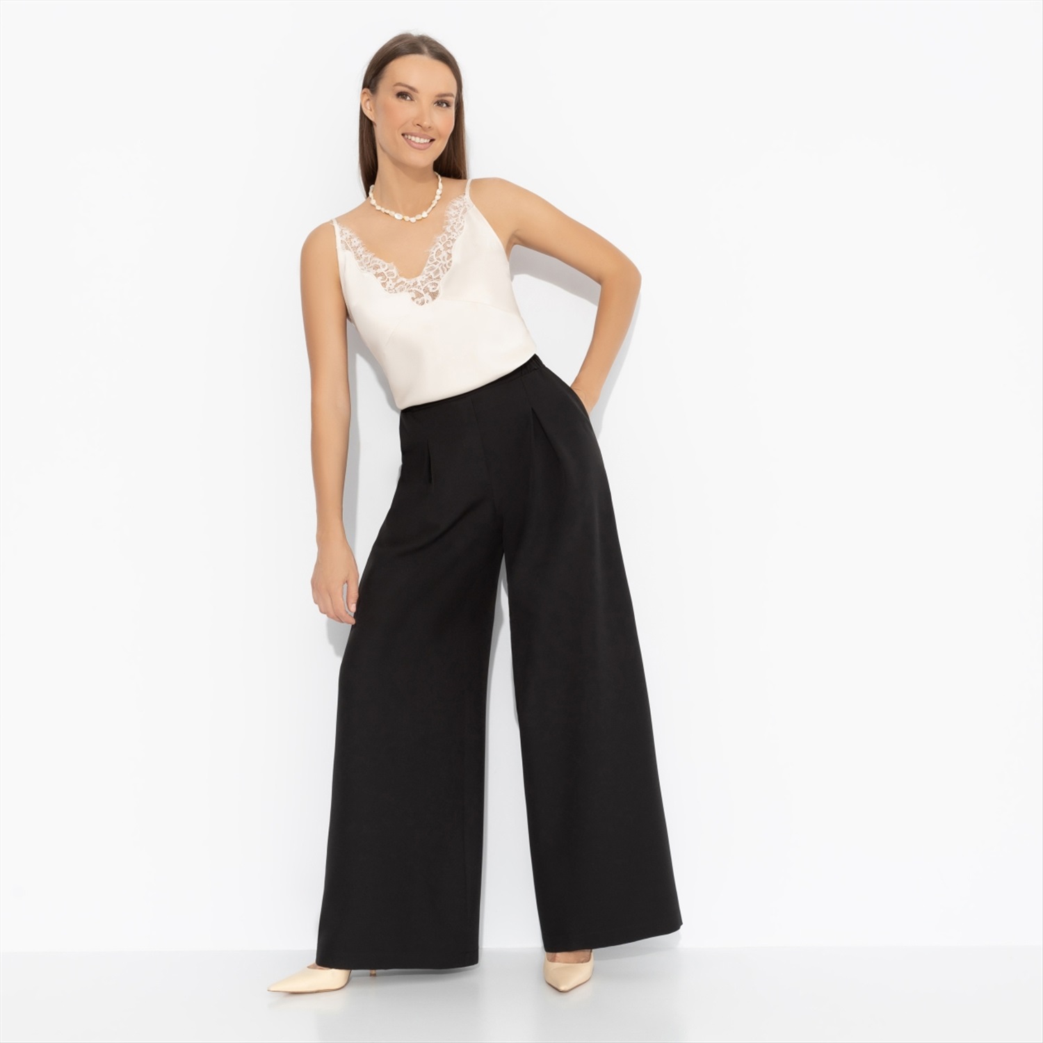 Состав: «Барби» (60% п/э, 37% вискоза, 3% спандекс) Плотность ткани: Средняя Тип ткани: Текстиль Вид застежки: Нет Высота посадки: Средняя Карманы: В боковом шве Основной цвет ткани: Черный Отрезная талия: Есть Подклад: Нет Резинка по талии: Есть Рисунок/раппорт: Нет, все изделия идентичны Сезон: Круглогодичный Силуэт: Свободный Стиль: Деловой Фасон брюк: Палаццо Фасон брюк: Палаццо Параметры модели на фото: