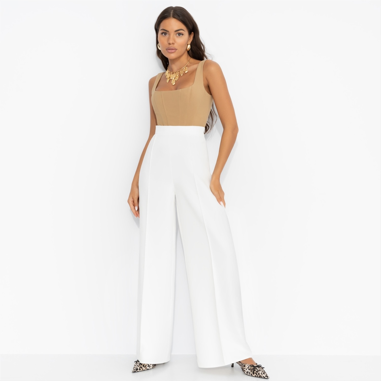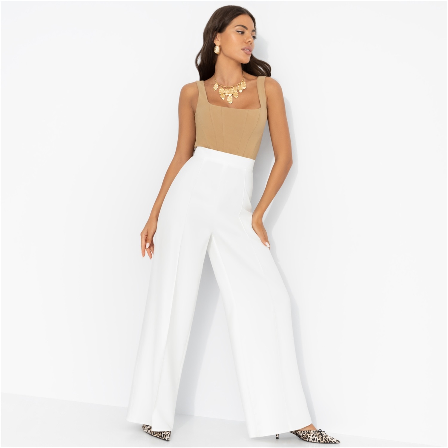 Состав: «Барби» (95% п/э, 5% эластан) Плотность ткани: Средняя Тип ткани: Текстиль Вид застежки: Молния Высота посадки: Средняя Карманы: Нет Основной цвет ткани: Белый Отрезная талия: Есть Подклад: Нет Резинка по талии: Нет Рисунок/раппорт: Нет, все изделия идентичны Сезон: Круглогодичный Силуэт: Свободный Стиль: Классический Фасон брюк: Клеш Фасон брюк: Клеш Параметры модели на фото: