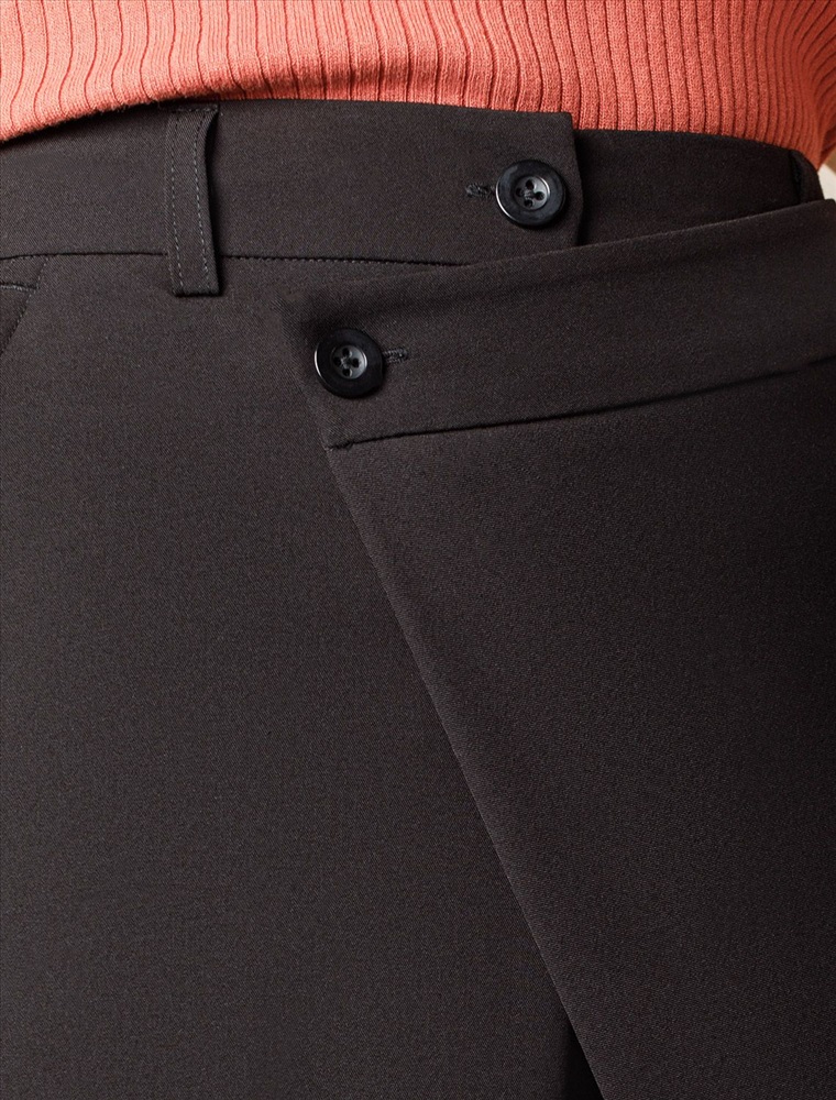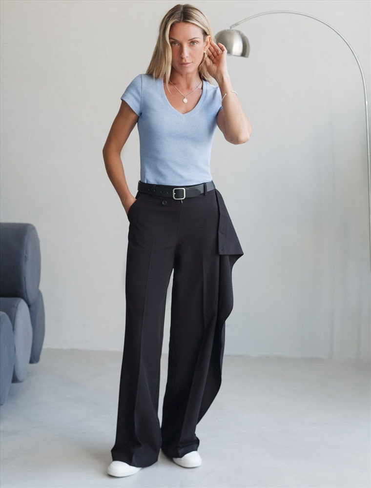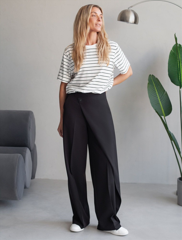 Размер товара на первом фото: 42 Брюки свободного кроя выполнены из эластичной поливискозы. Модель с трендовой застежкой на запАх моментально делает образ стильным, скрывает недостатки и подчеркивает достоинства фигуры. Легкая и струящаяся ткань идеально подойдет для повседневных образов и впишется в офисный дресс код. Свободный силуэт подходит для любой фигуры. Комментарии к товару