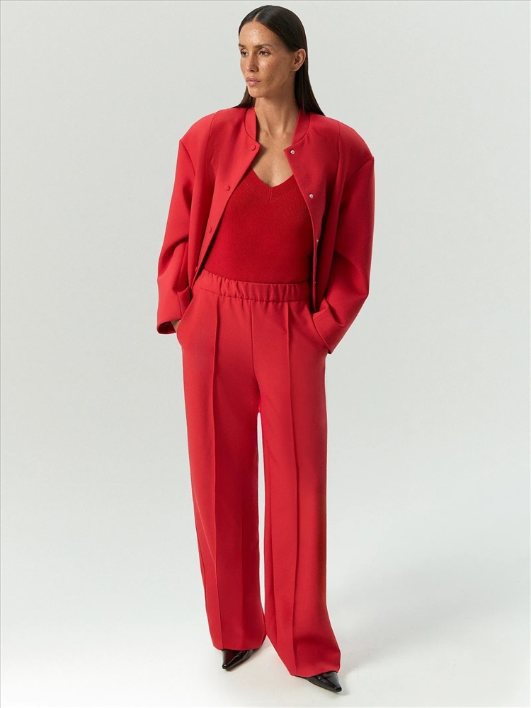 Яркие брюки сделают повседневные образы актуальнее и смелее. Сочный цвет поднимет настроение в любую погоду. Модель выполнена на удобной широкой кулиске и имеет среднюю посадку. Выделяющаяся застроченная складка придаёт оригинальности. По бокам располагаются аккуратные прорезные карманы. Завершить образ с брюками можно бомбером из комплекта.