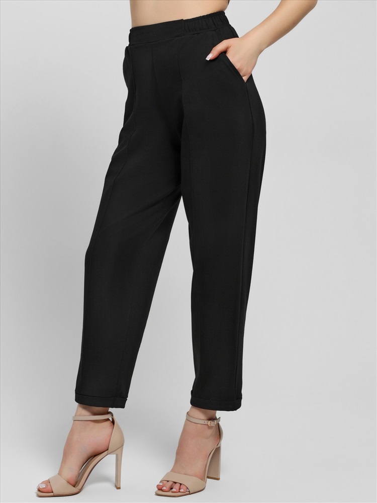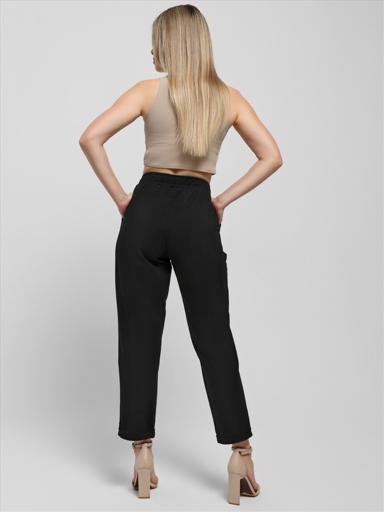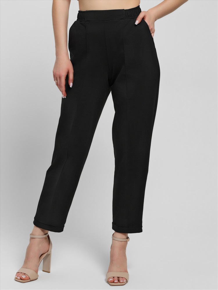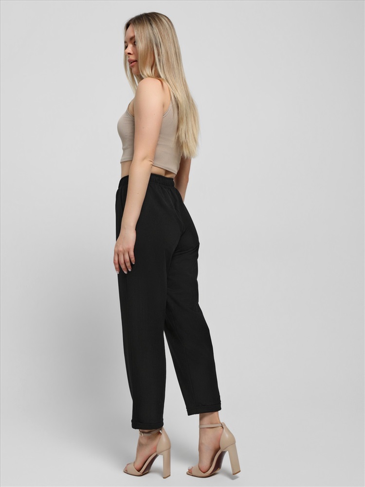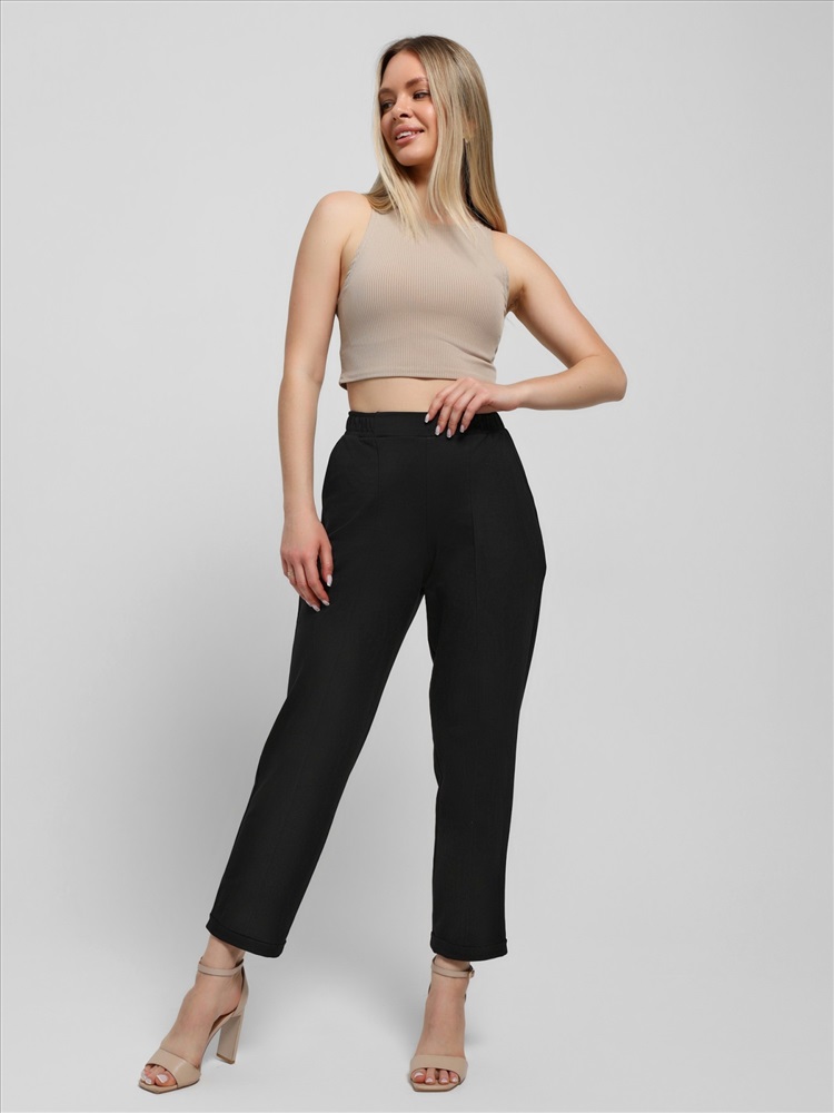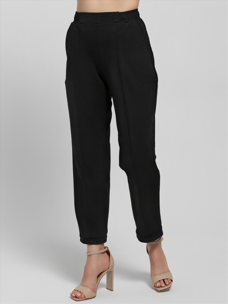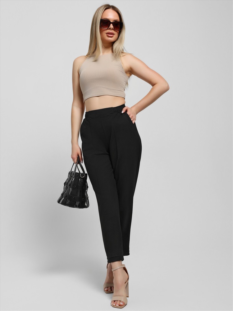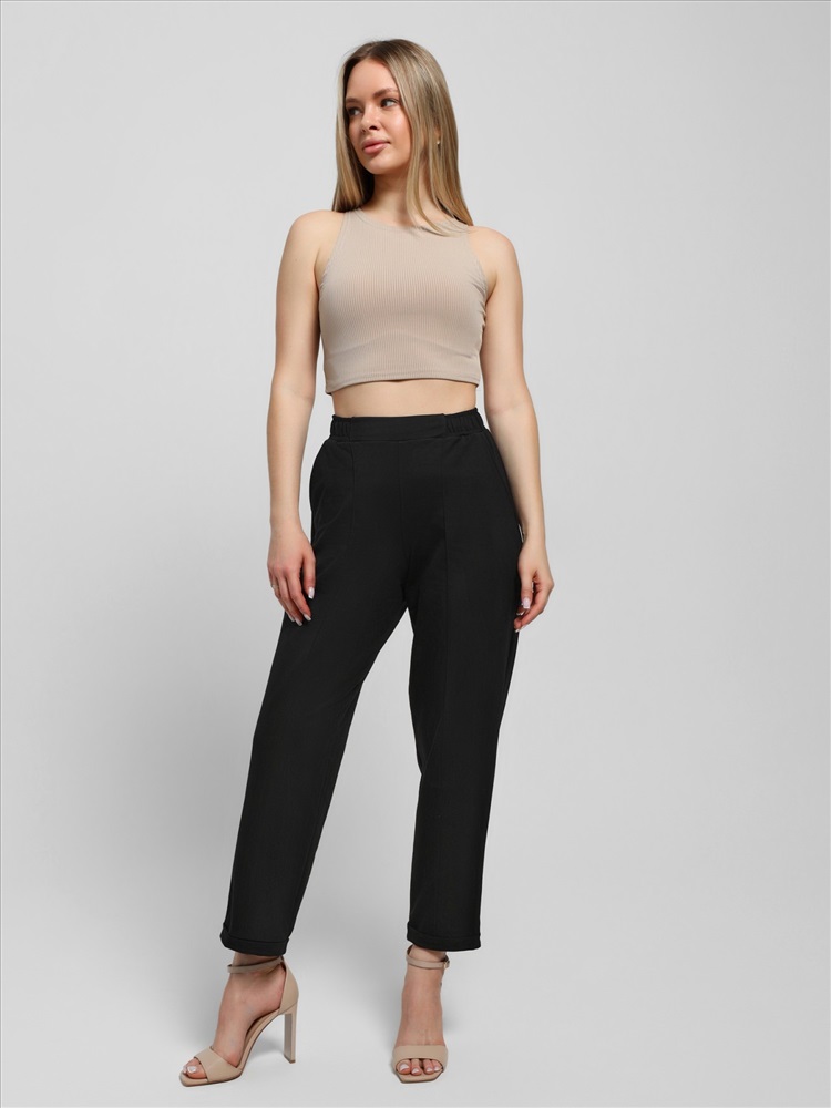 Брюки из трикотажного полотна «футер-двунитка», длинные, классического покроя, на притачном поясе с эластичной тесьмой внутри и карманами в боковых швах. Передние половины застрочены по линиям центра, на задних половинах обработаны две вытачки в области линии талии.