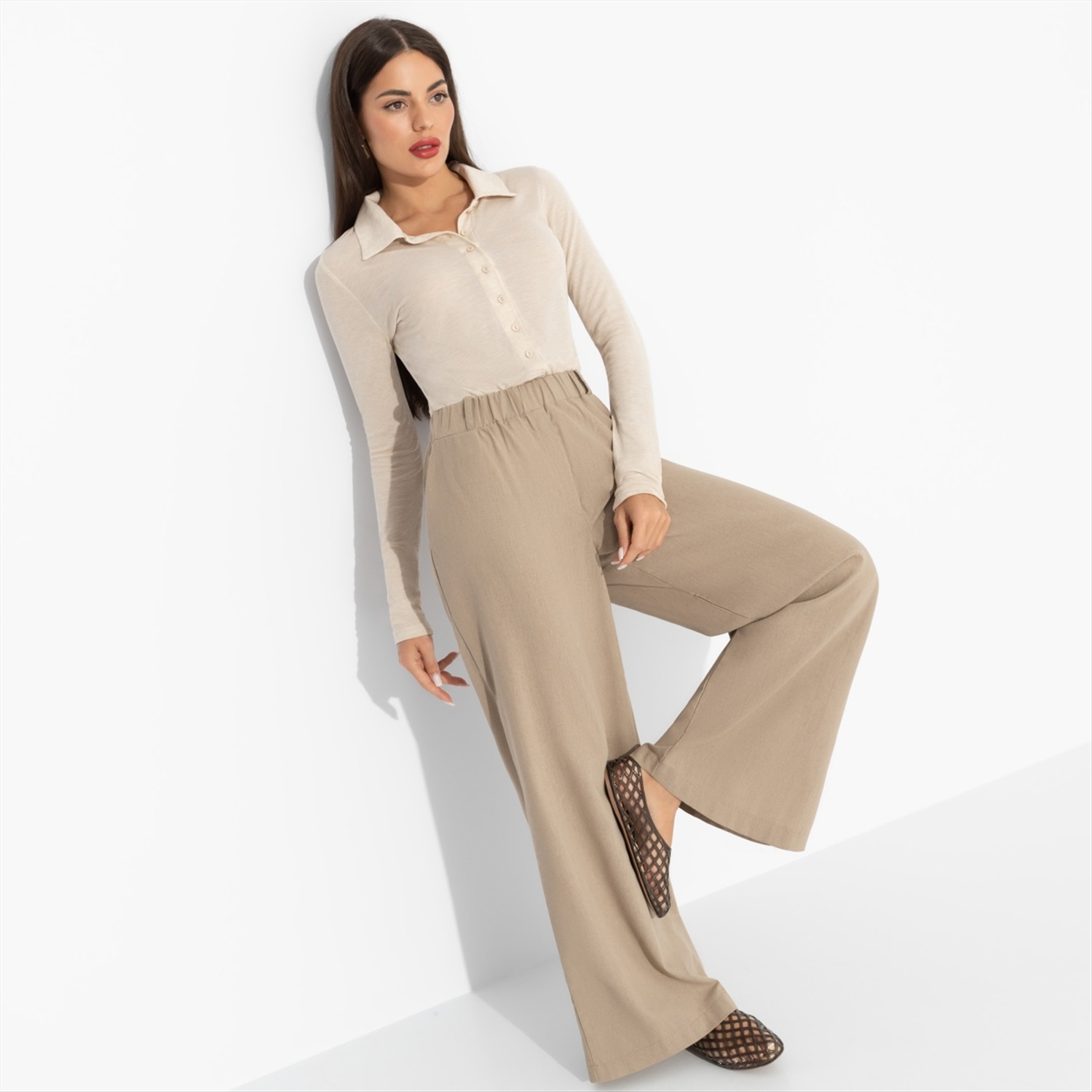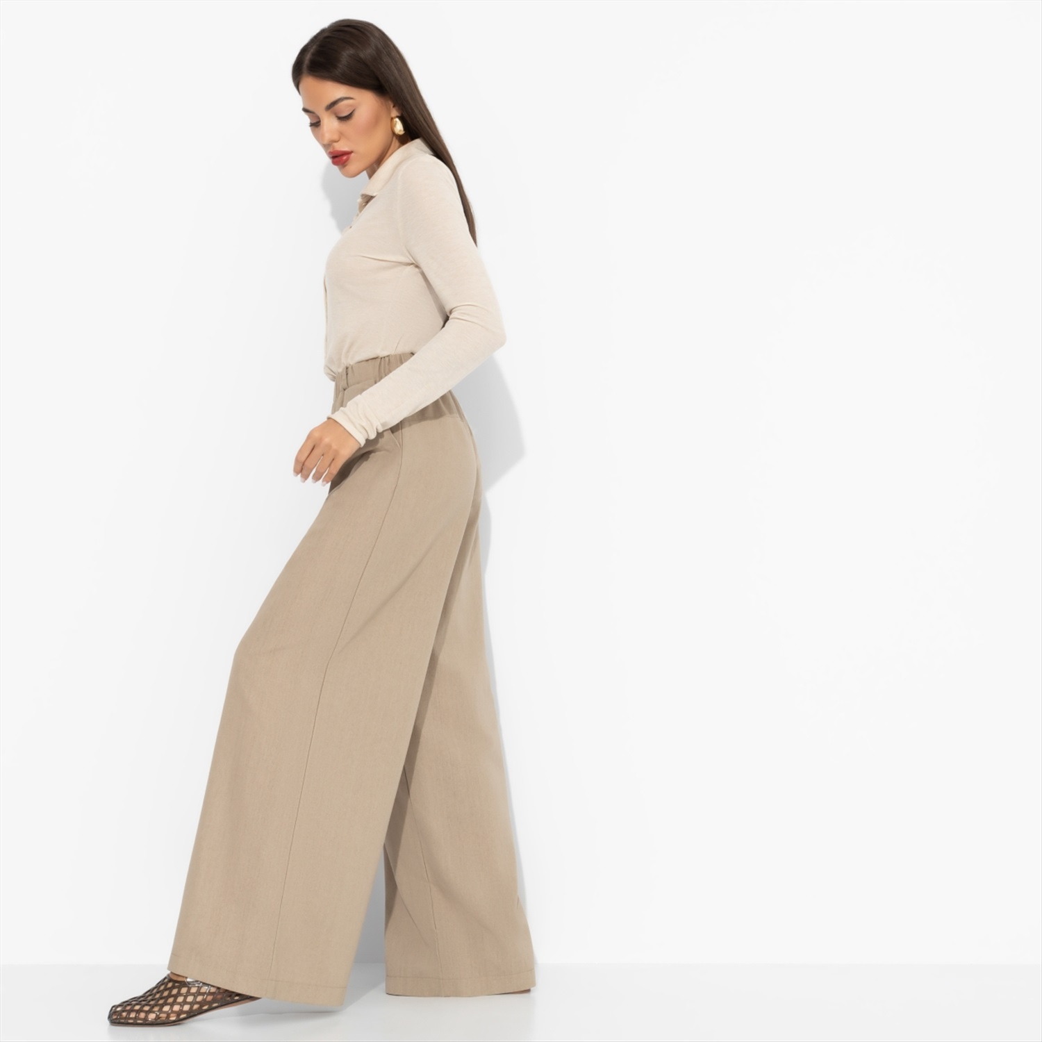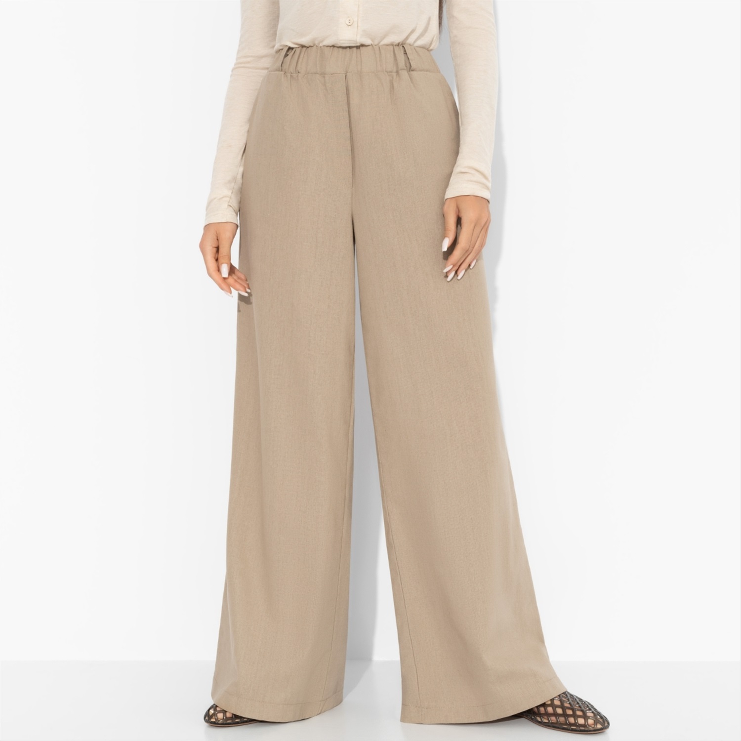 Состав: Лен вискозный (65% лен, 35% п/э) Плотность ткани: Средняя Тип ткани: Текстиль Вид застежки: Нет Высота посадки: Высокая Карманы: В боковом шве Основной цвет ткани: Бежевый Отрезная талия: Есть Подклад: Нет Резинка по талии: Есть Рисунок/раппорт: Нет, все изделия идентичны Сезон: Лето Стиль: Классический Фасон брюк: Палаццо Фасон брюк: Палаццо Параметры модели на фото: