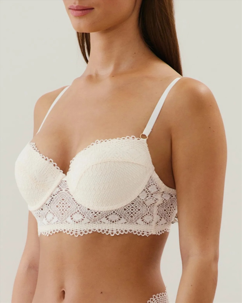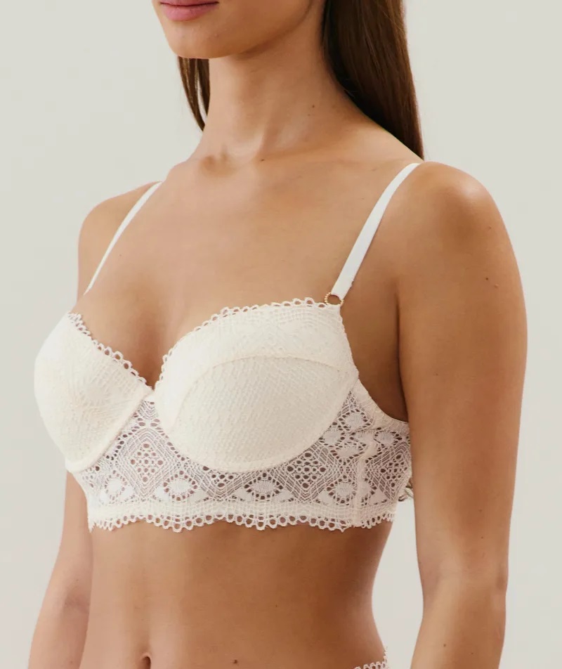 Descubre DESERTIZ, un bustier push-up de encaje delicado que combina feminidad y comodidad. Su corte elegante se ajusta a la silueta con ligereza, ofreciendo un soporte sutil mientras realza las curvas. Disponible en blanco luminoso para un look atemporal, se adapta a todos los gustos. Para un look completo, combínalo con el cheeky a juego.