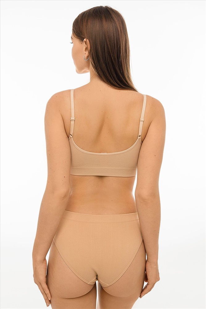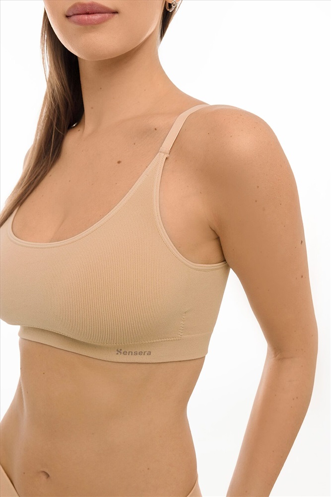 Страна производства: Россия Бюстгальтер-топ из эластичного рибового полотна в вертикальный рубчик с мягким подкладом и съемными вкладышами. Без каркасов и боковых корсетных вставок. Регулируемые несъемные тонкие бретели.Брендированная лента под грудью.
