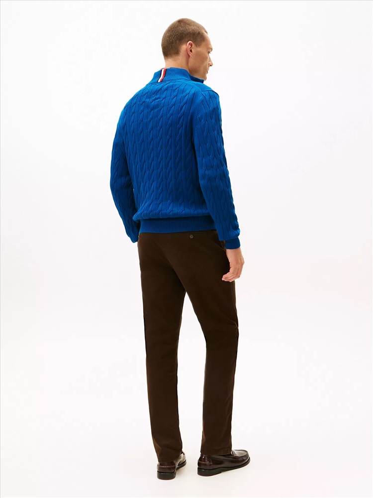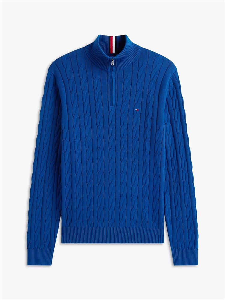 Tommy Hilfiger men's sweater. Made from combed cotton, our durable cable knit mockneck quarter-zip sweater stays soft and breathable wash after wash.