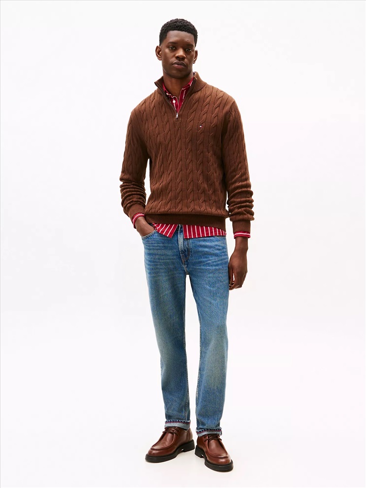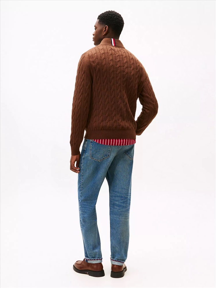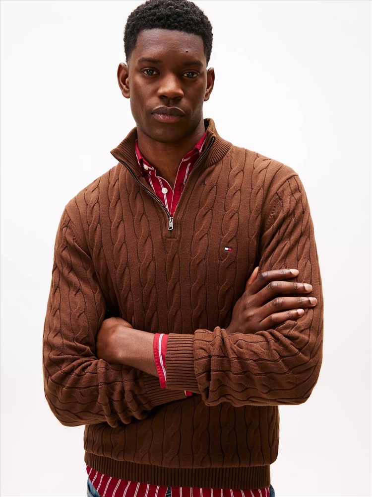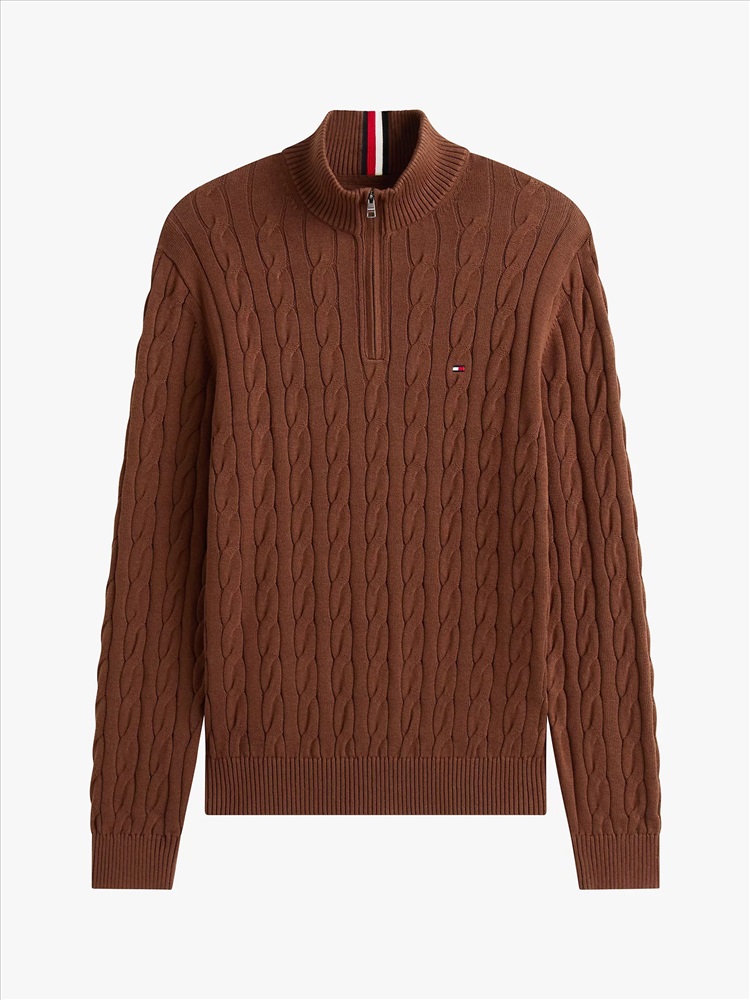 Tommy Hilfiger men's sweater. Made from combed cotton, our durable cable knit mockneck quarter-zip sweater stays soft and breathable wash after wash.